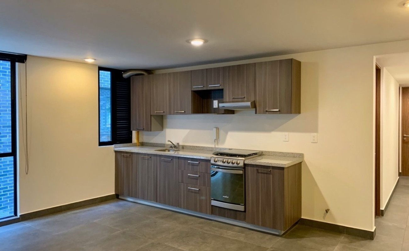 Consta de 2 recámaras, 2 baños completos, área social con cocina abierta integrada y 1 estacionamiento.