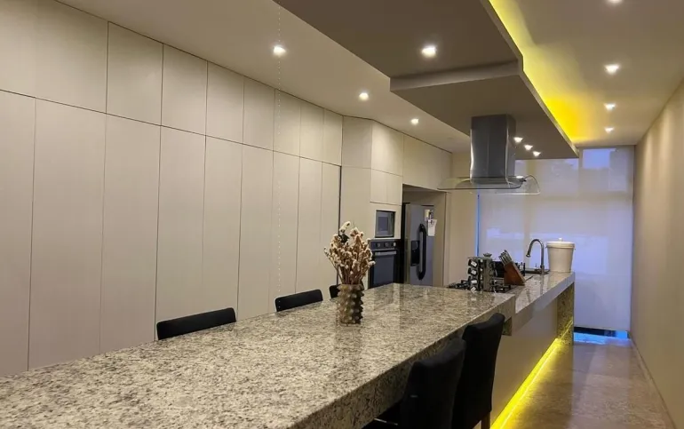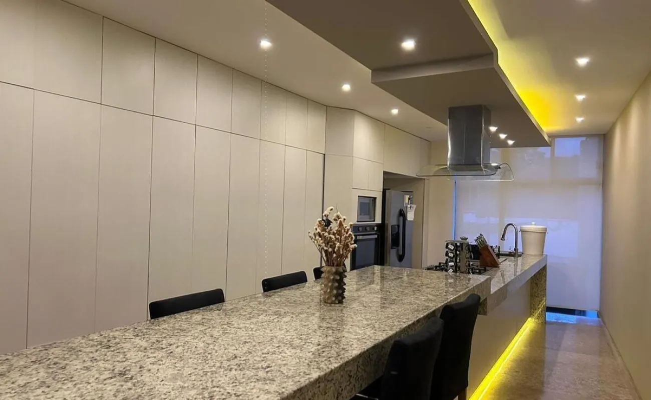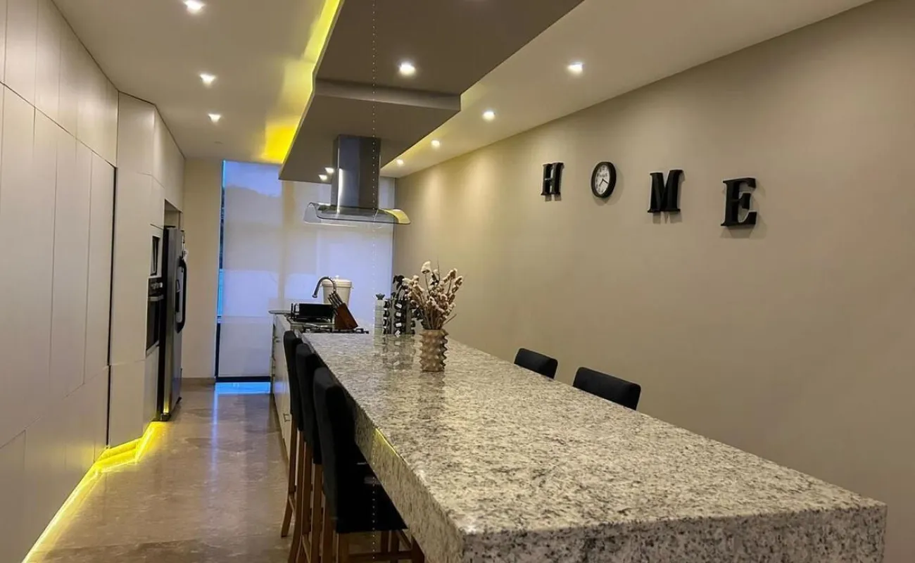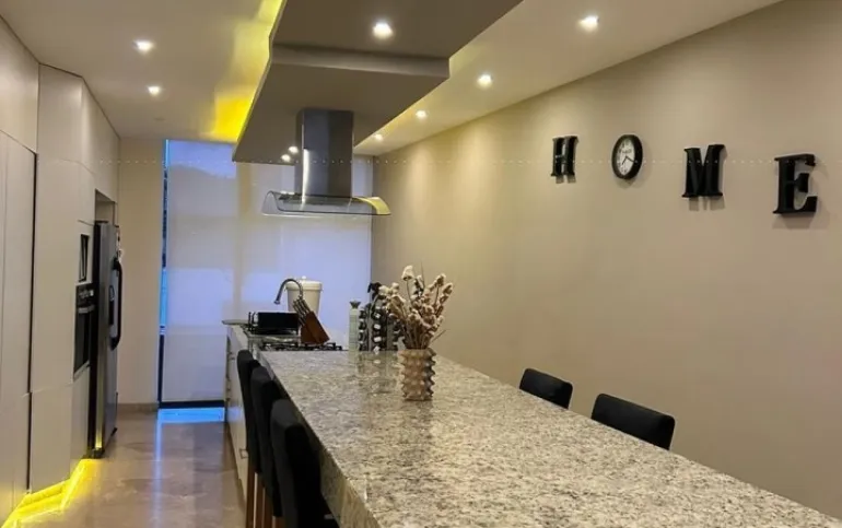 Pb sala y comedor a doble altura , cocina con barra de granito , patio trasero