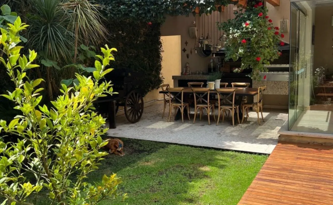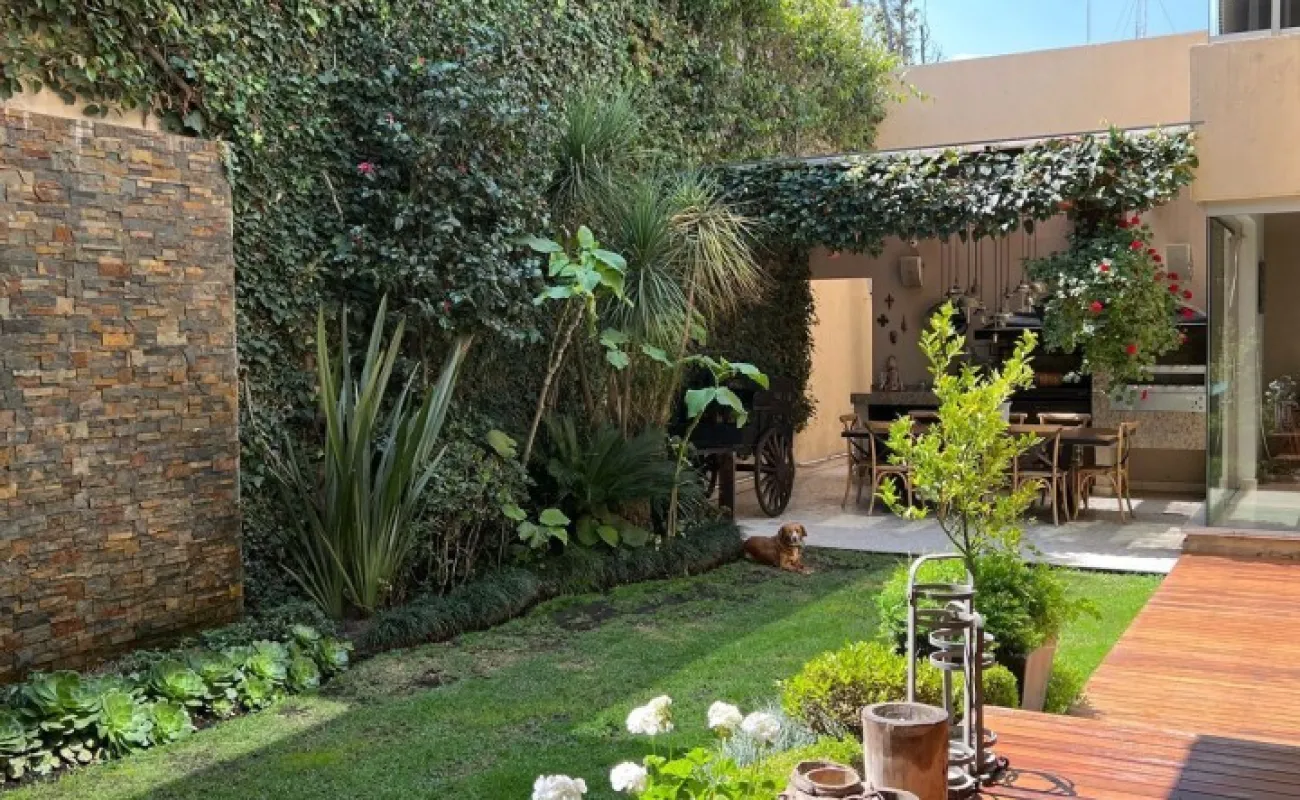 Planta baja: Hall, oficina o biblioteca, estancia y comedor con vista al jardín, antecomedor, baño de visitas, cocina, alacena, cuarto de lavado, patio de tendido. Hermosa terraza con sala y comedor, ambos exteriores.