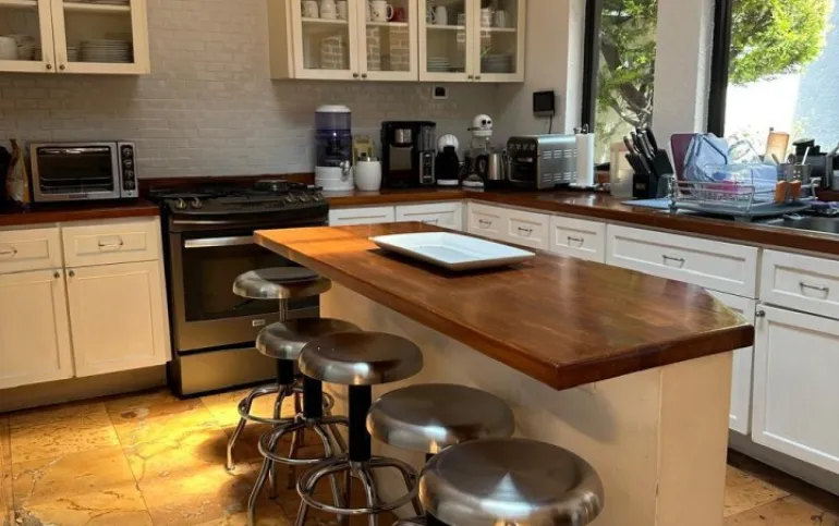 La cocina, en excelentes condiciones, incluye un mueble despensa para un almacenamiento óptimo.