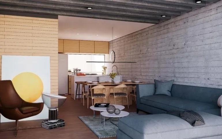 - Primer nivel: Estancia Sala-Comedor, Cocina con barra de granito y campana extractora de humo y olores, barra con desayunador con espacio para tres bancos, fregadero de llave flexible, y piso laminado tipo madera.