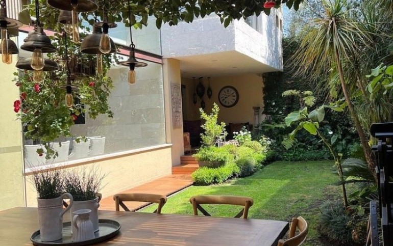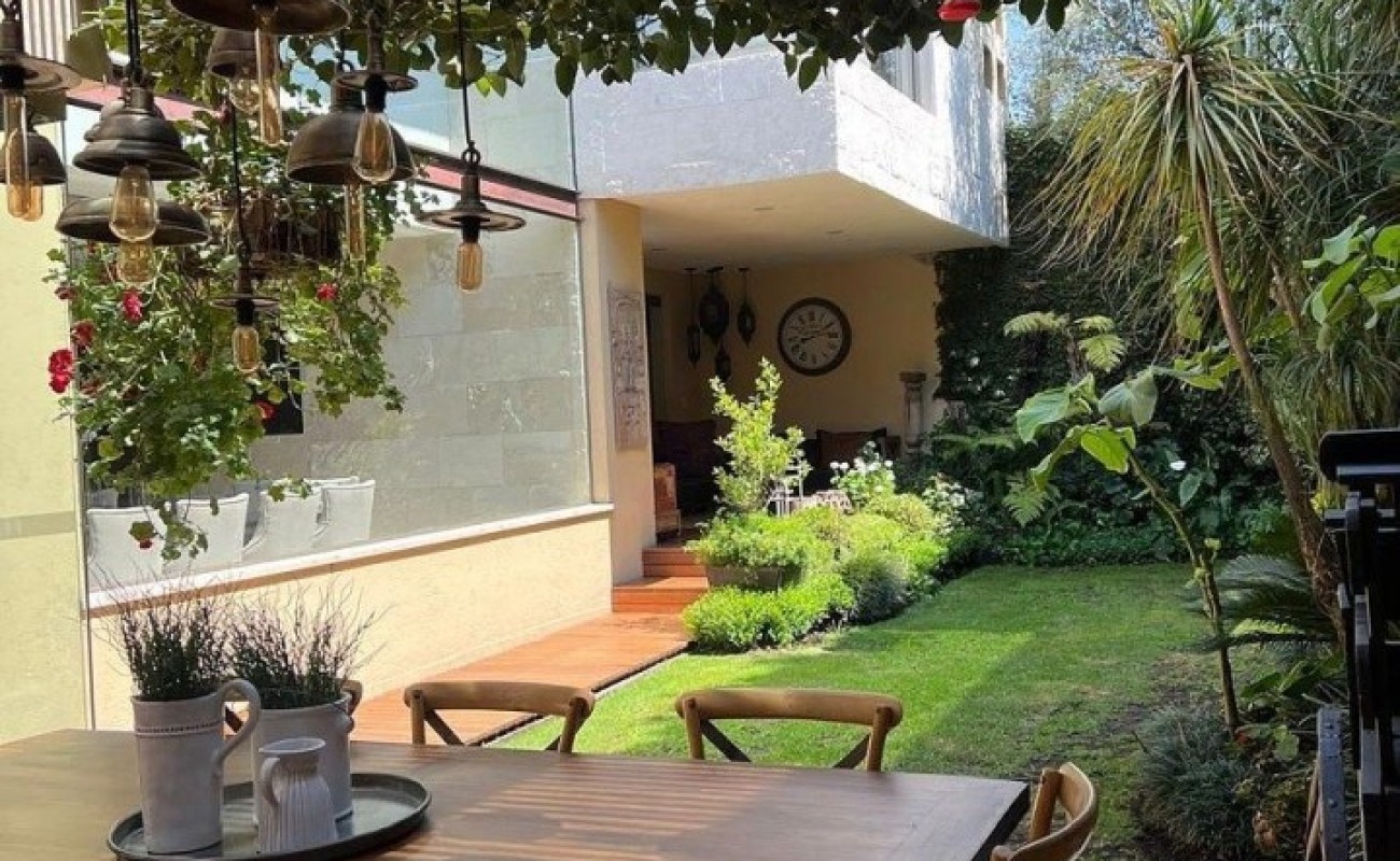 Planta baja: Hall, oficina o biblioteca, estancia y comedor con vista al jardín, antecomedor, baño de visitas, cocina, alacena, cuarto de lavado, patio de tendido. Hermosa terraza con sala y comedor, ambos exteriores.