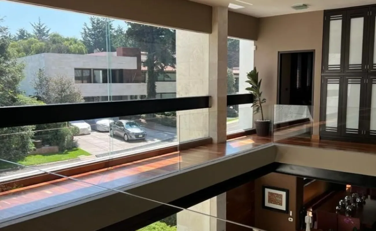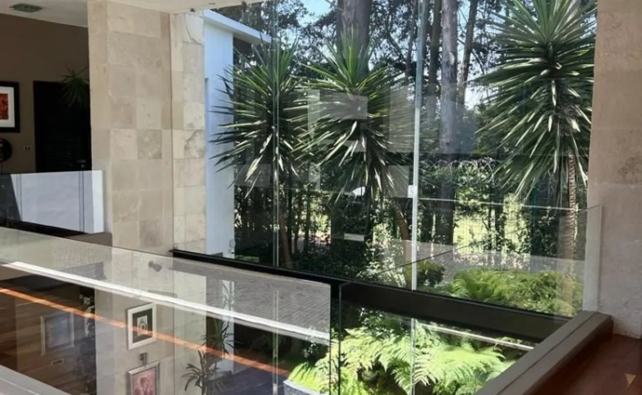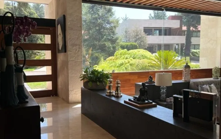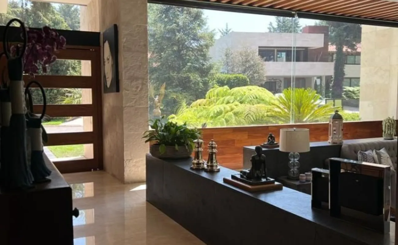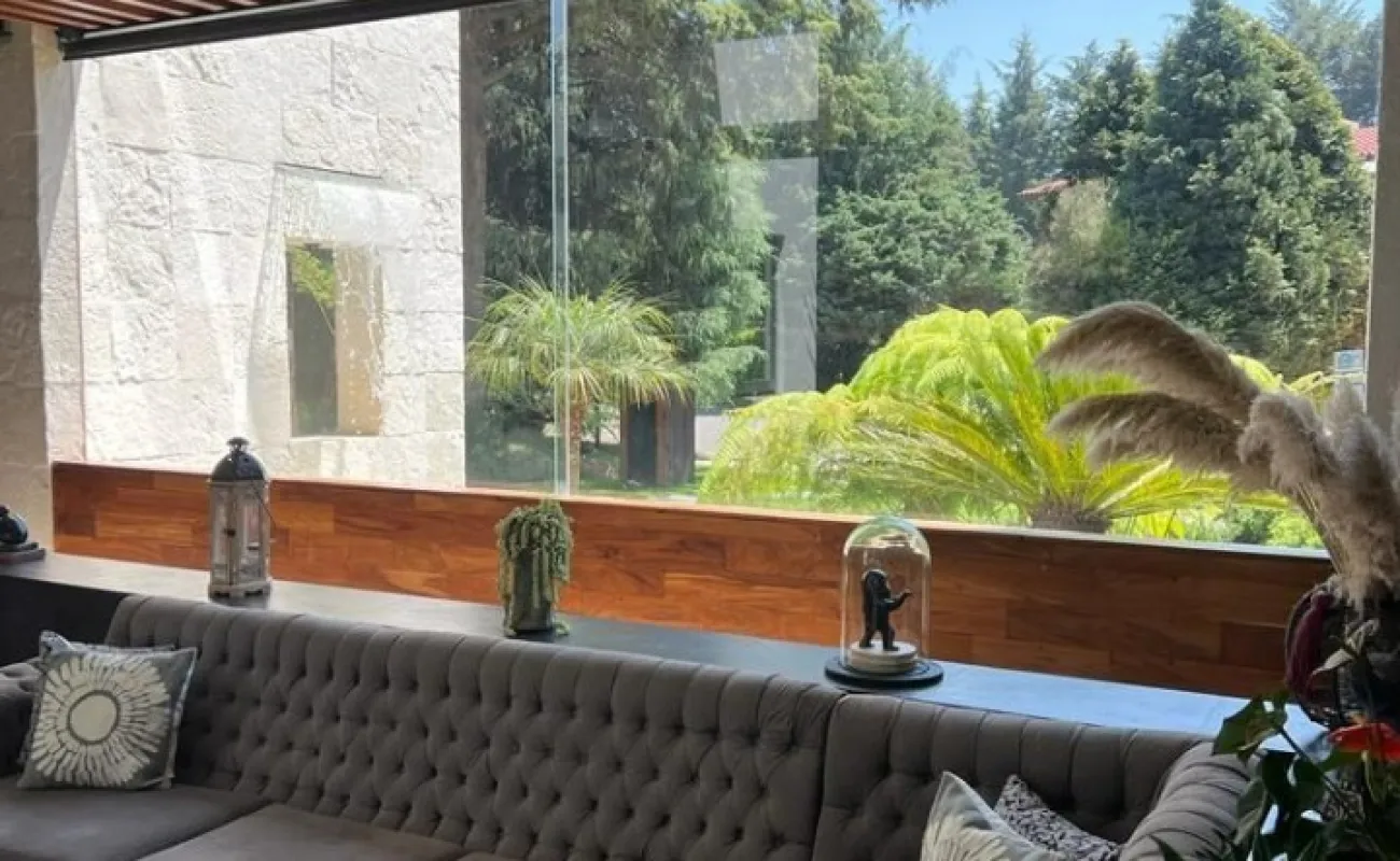 Estancia principal con doble altura, ventanales con vista boscosa, comedor, cava subterránea, terraza, dos chimeneas de gas, cocina equipada, desayunador, sala de TV, dos despachos, baño de visitas, acabados de lujo.
