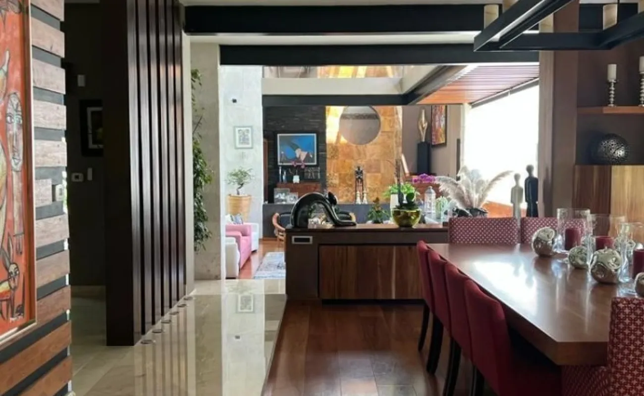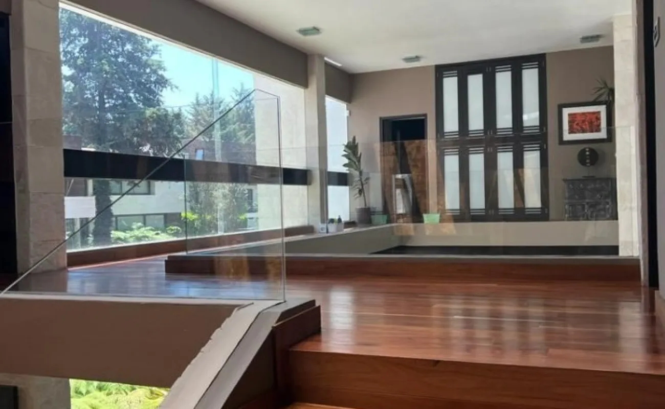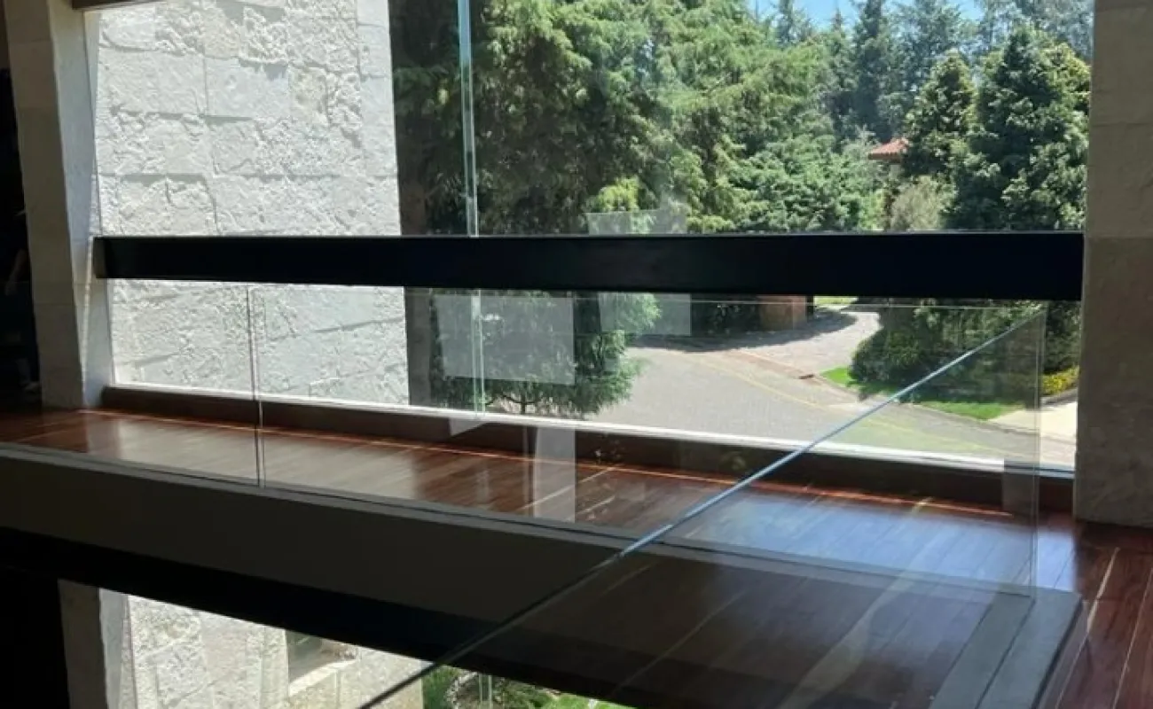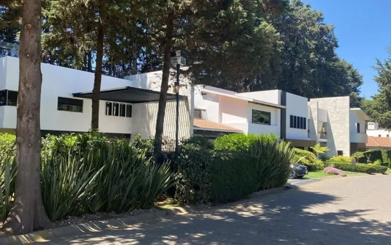 Estancia principal con doble altura, ventanales con vista boscosa, comedor, cava subterránea, terraza, dos chimeneas de gas, cocina equipada, desayunador, sala de TV, dos despachos, baño de visitas, acabados de lujo.