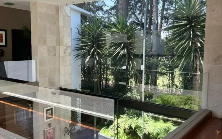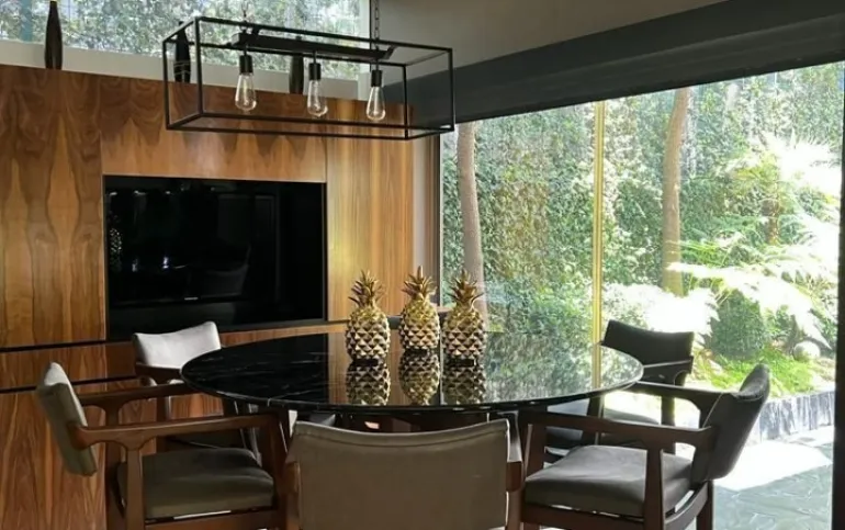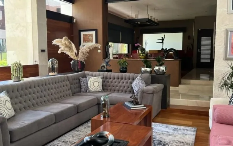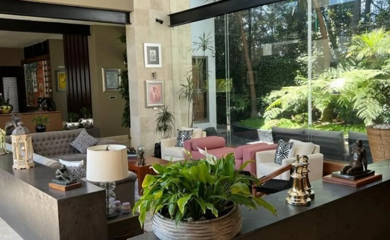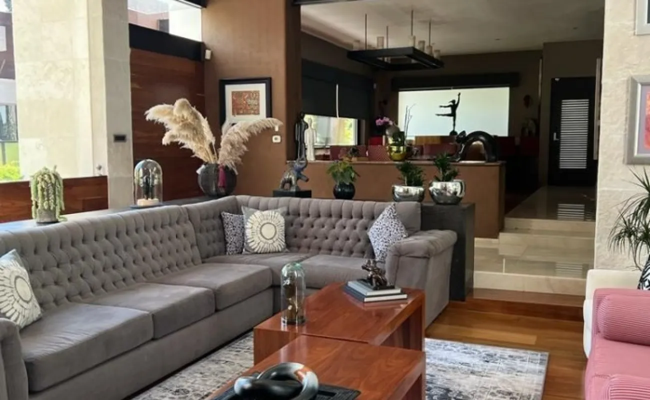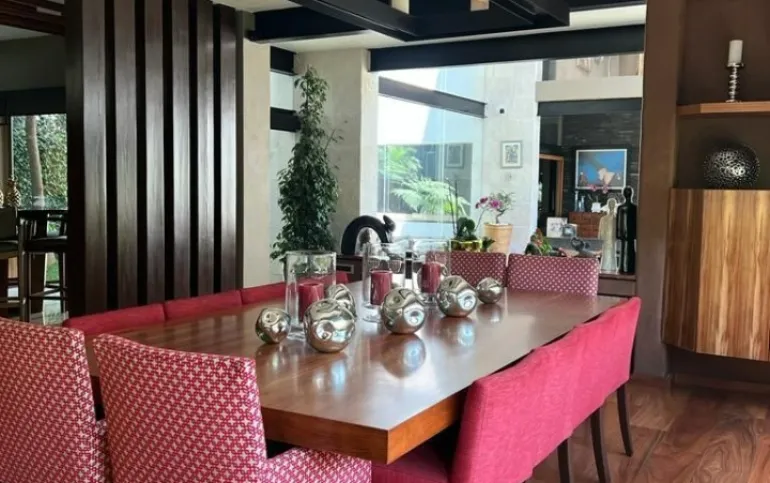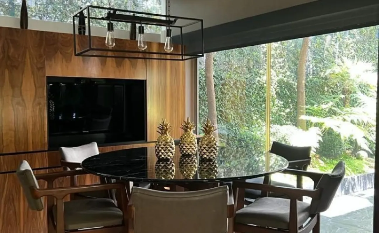 Estancia principal con doble altura, ventanales con vista boscosa, comedor, cava subterránea, terraza, dos chimeneas de gas, cocina equipada, desayunador, sala de TV, dos despachos, baño de visitas, acabados de lujo.