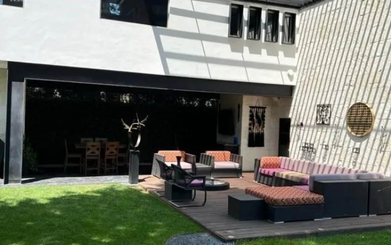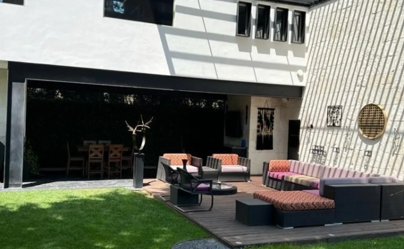 Jardín lateral y gran terraza exterior con área de comedor y estancia, área para asador y medio baño para visitas.
