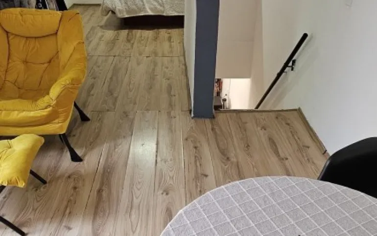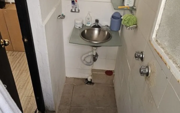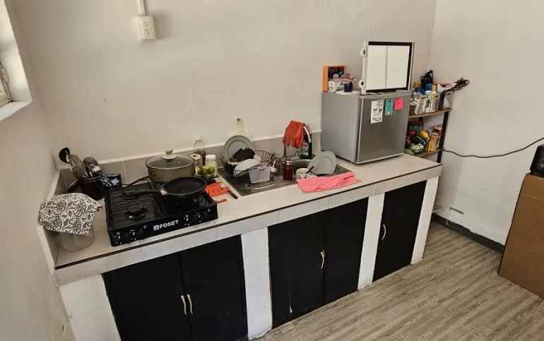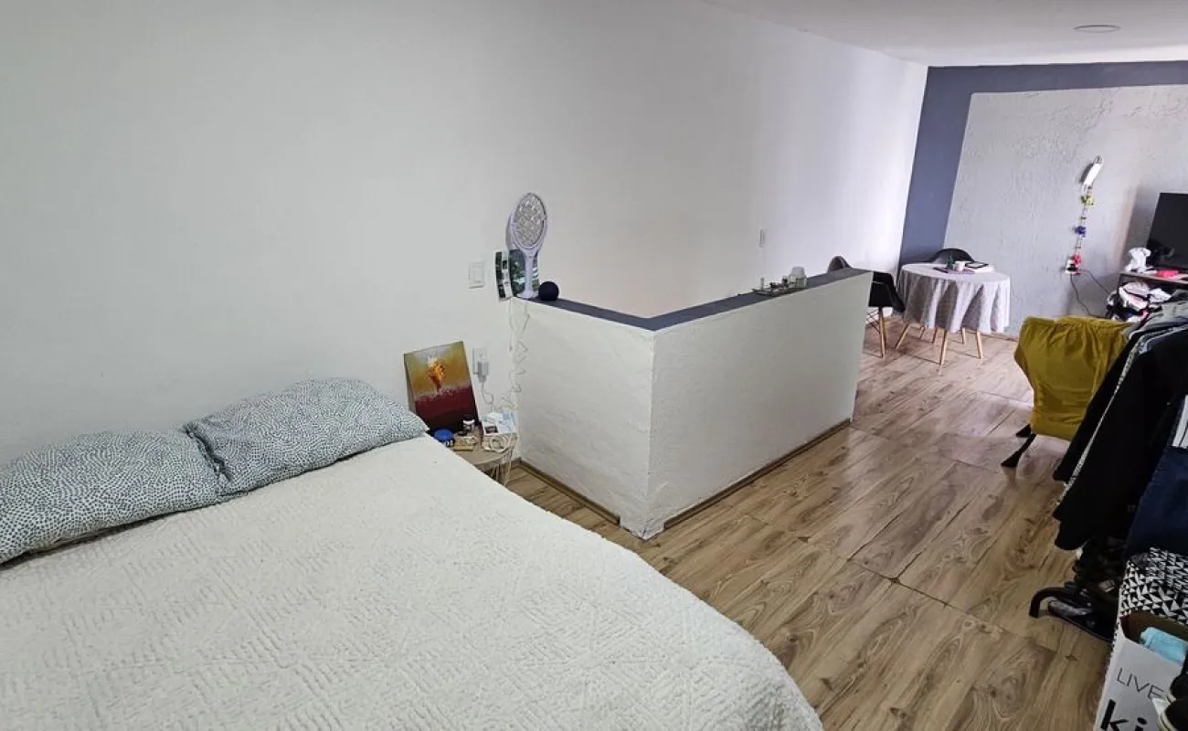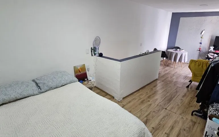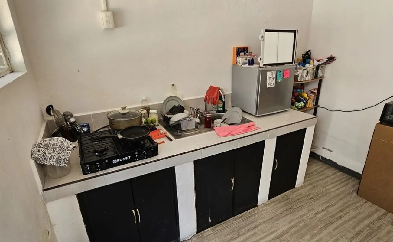 Departamento interior: Cocina, baño completo, escalera de acceso al 1er piso, estancia sala-comedor con balcón y recámara.