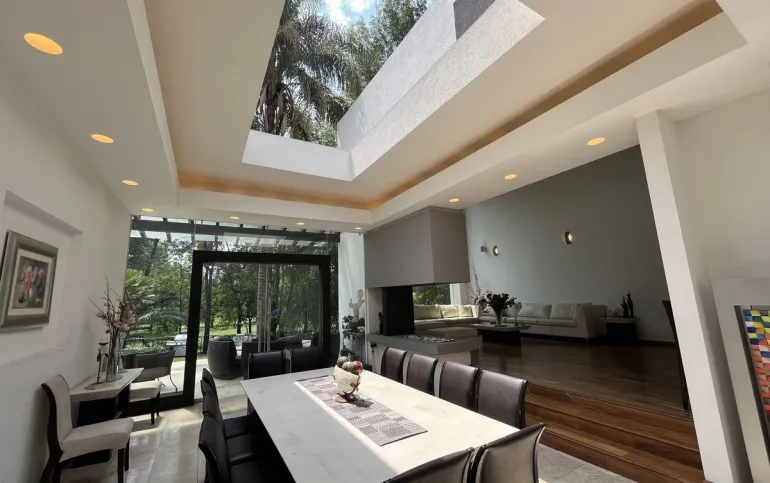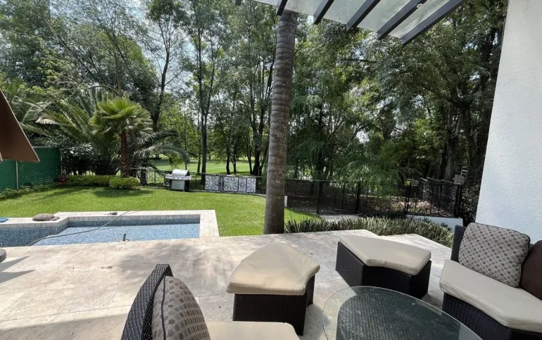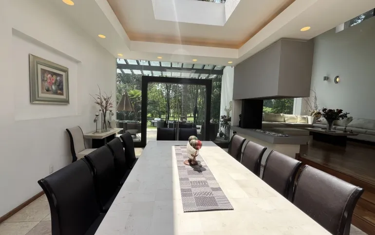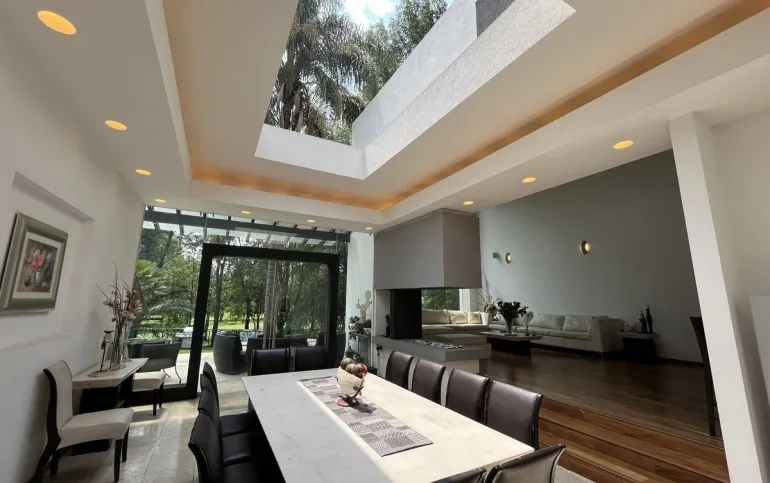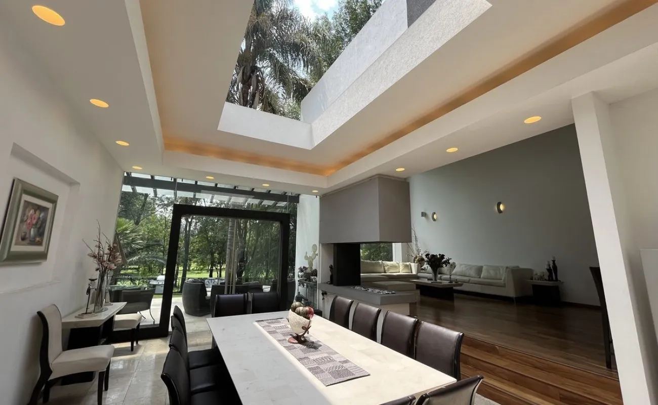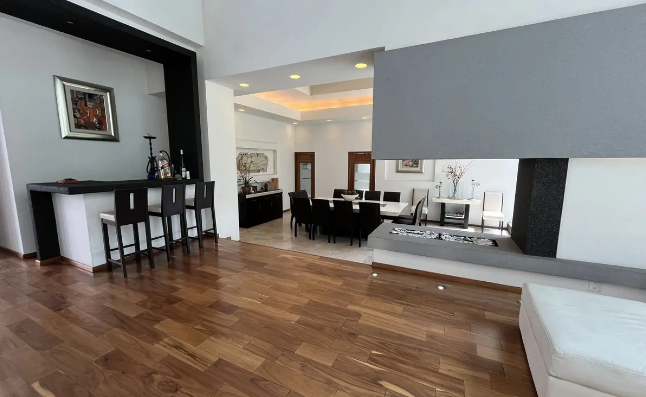 Entrando se encuentra medio baño de visitas, bar , amplísimo espacio para sala y comedor con un hermoso ventanal que da al jardín y al campo de golf, chimenea de etanol y el comedor con techo corredizo para abrir el espacio al aire libre. Linda y equipada cocina moderna, antecomedor y una 2a cocina de apoyo además de enorme despensa. La recámara principal está un piso arriba y cuenta con sala de TV, enorme terraza con gran vista, baño completo y vestidor, todas las persianas de la casa son eléctricas.