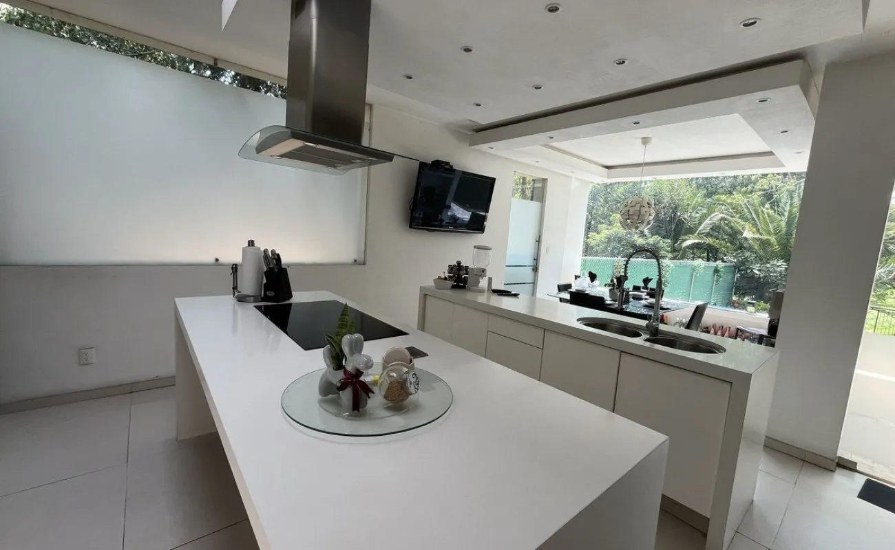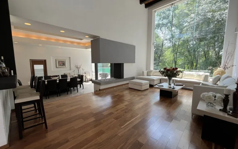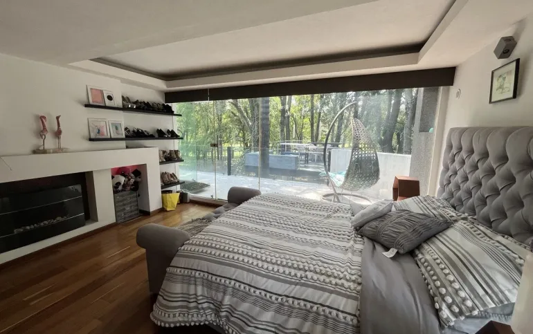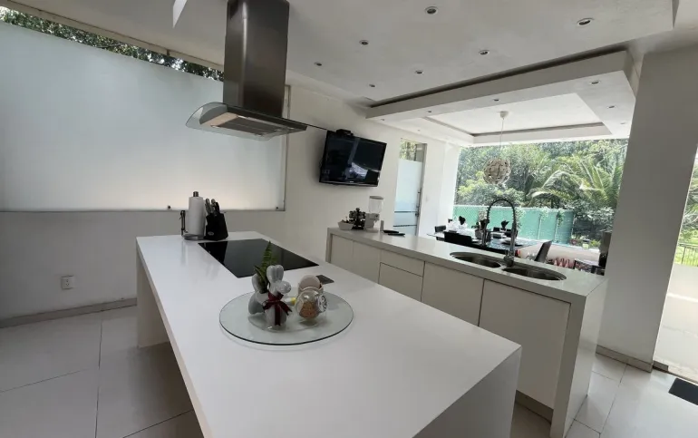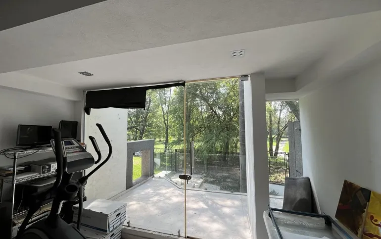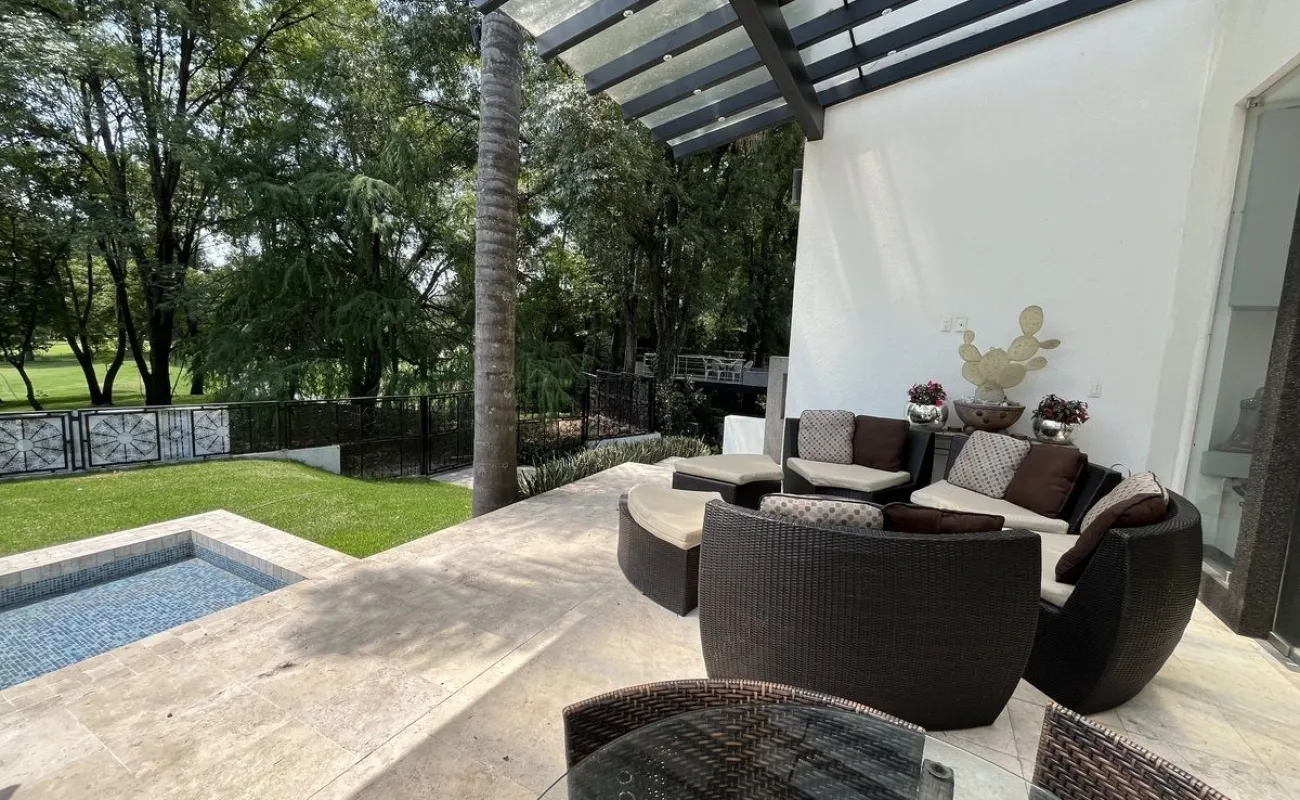 Entrando se encuentra medio baño de visitas, bar , amplísimo espacio para sala y comedor con un hermoso ventanal que da al jardín y al campo de golf, chimenea de etanol y el comedor con techo corredizo para abrir el espacio al aire libre. Linda y equipada cocina moderna, antecomedor y una 2a cocina de apoyo además de enorme despensa. La recámara principal está un piso arriba y cuenta con sala de TV, enorme terraza con gran vista, baño completo y vestidor, todas las persianas de la casa son eléctricas.