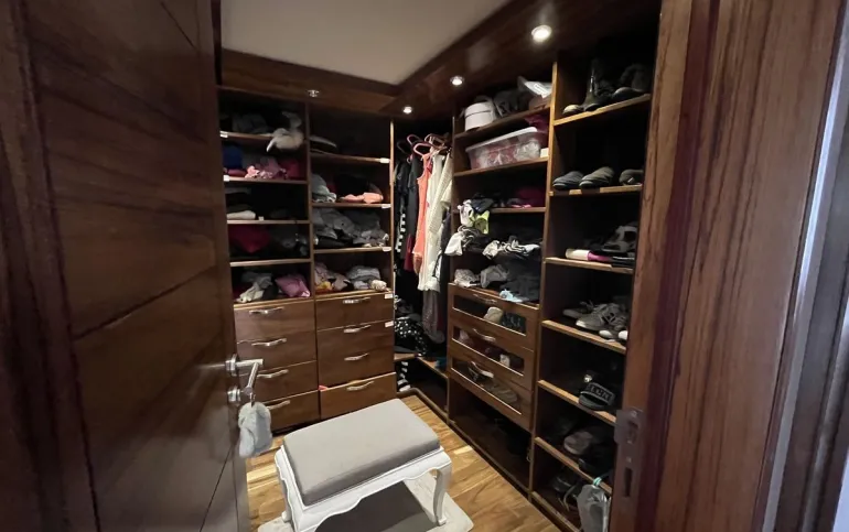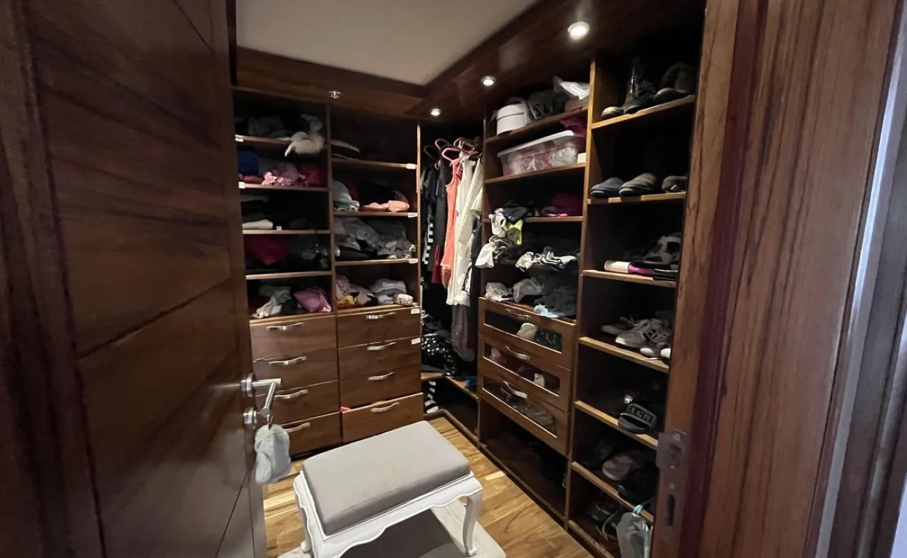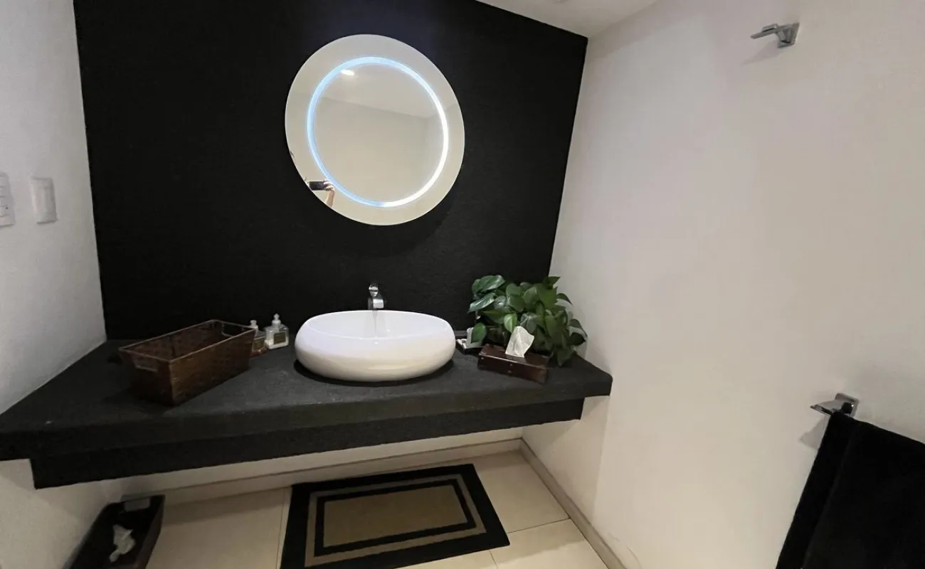 Abajo está la sala de TV y las 3 recámaras secundarias todas con terraza y 2 con baño completo y vestidor adentro de ellas y una más con baño completo afuera. En el área del jardín hay una terraza, fuente , jacuzzi para 12 personas. La parte de abajo es social y tiene cuarto de juegos, cuarto social, barra y cava así como 3 baños para mujeres y 3 de hombres con lavabo. Además de otras 2 terrazas una de ellas con chimenea y otra con una sombra espectacular que dan los enormes árboles del jardín.