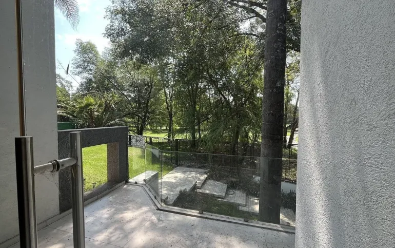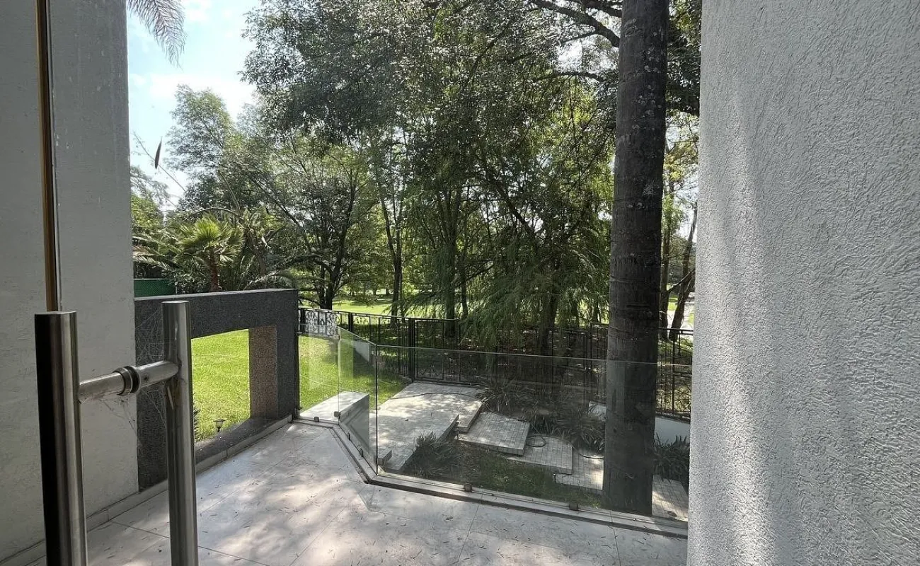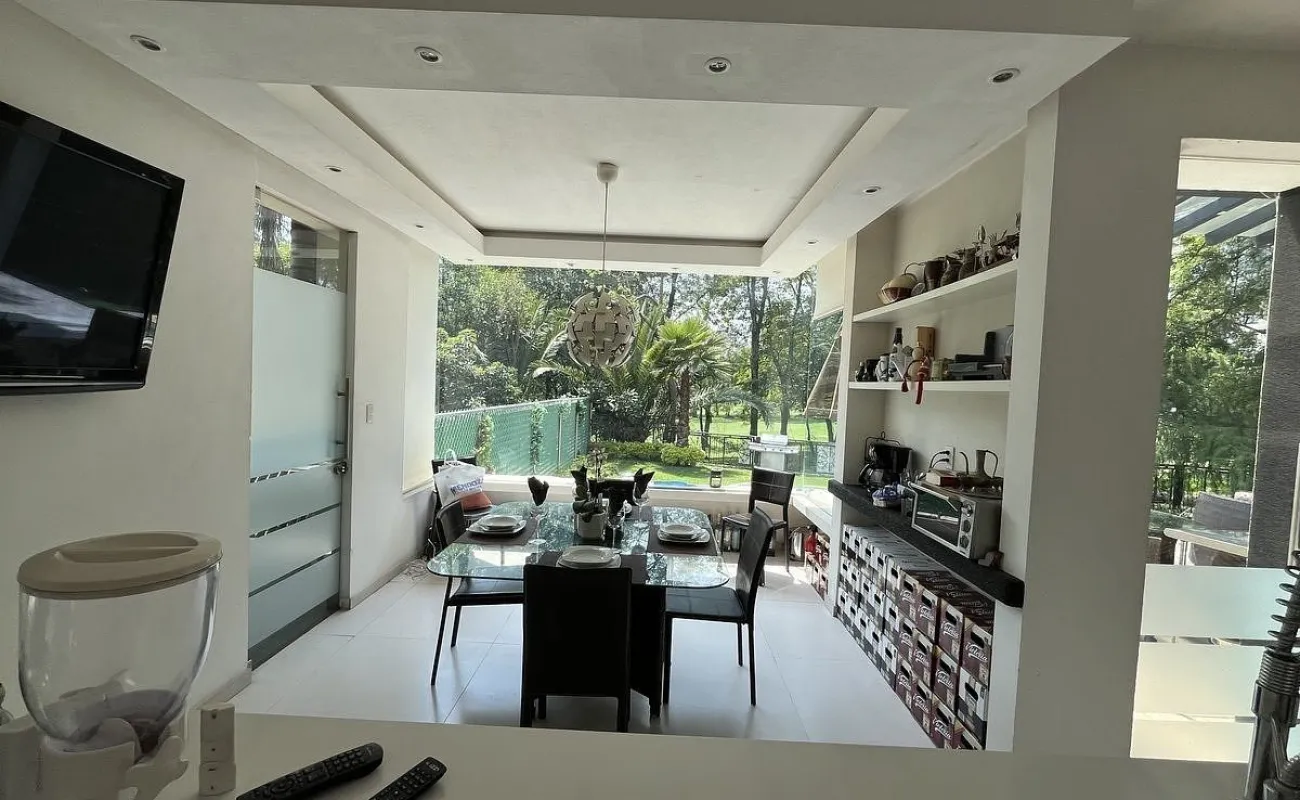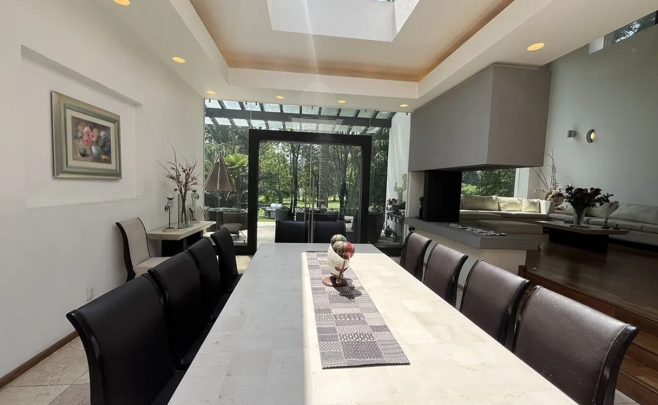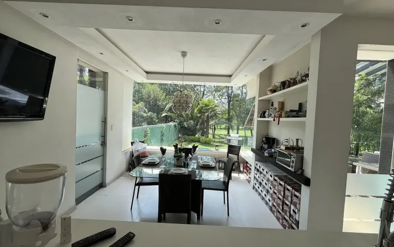 Entrando se encuentra medio baño de visitas, bar , amplísimo espacio para sala y comedor con un hermoso ventanal que da al jardín y al campo de golf, chimenea de etanol y el comedor con techo corredizo para abrir el espacio al aire libre. Linda y equipada cocina moderna, antecomedor y una 2a cocina de apoyo además de enorme despensa. La recámara principal está un piso arriba y cuenta con sala de TV, enorme terraza con gran vista, baño completo y vestidor, todas las persianas de la casa son eléctricas.