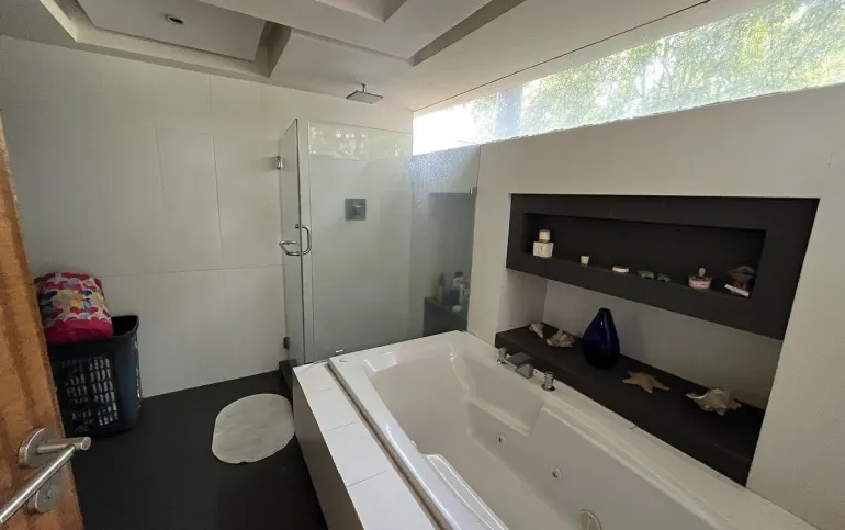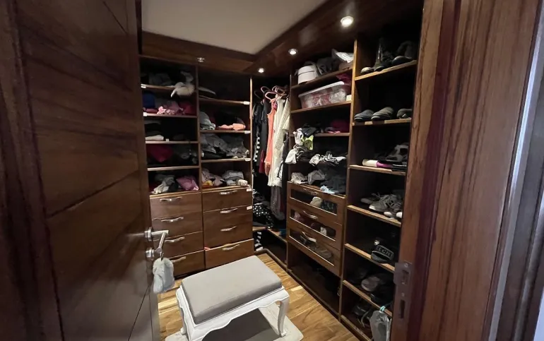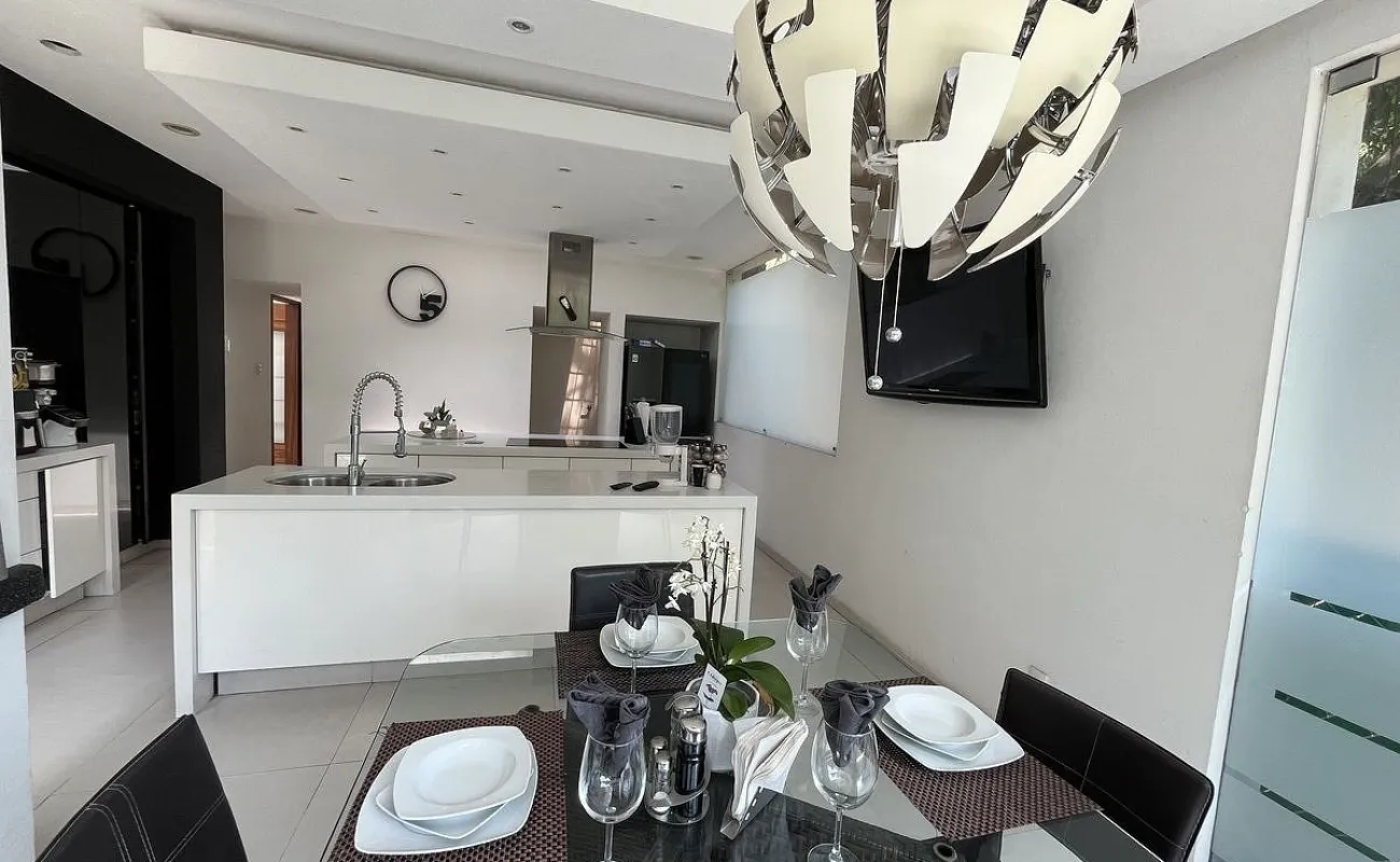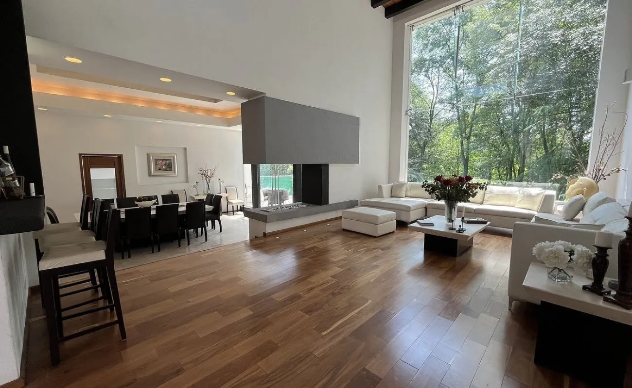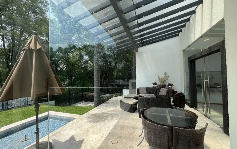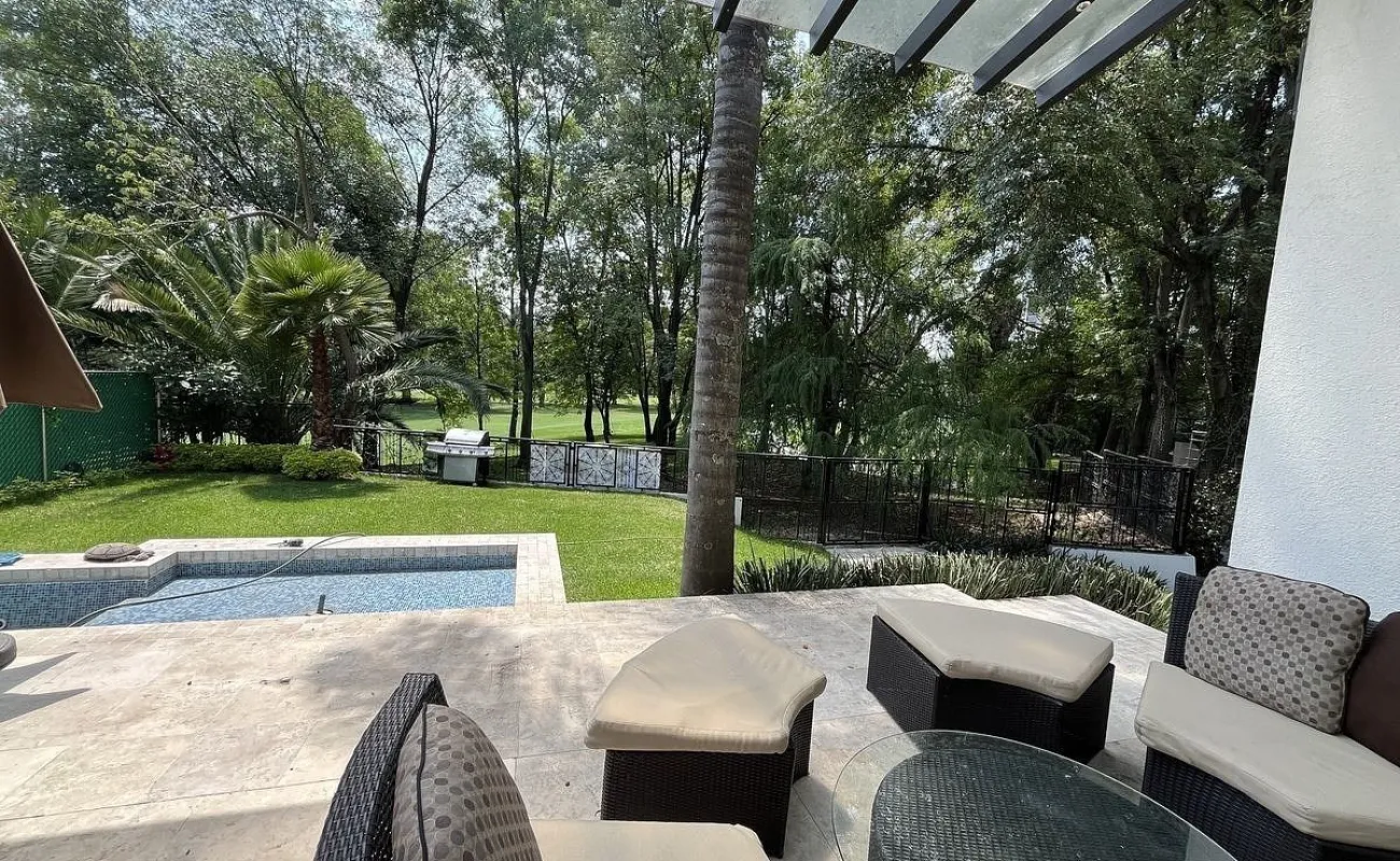 Entrando se encuentra medio baño de visitas, bar , amplísimo espacio para sala y comedor con un hermoso ventanal que da al jardín y al campo de golf, chimenea de etanol y el comedor con techo corredizo para abrir el espacio al aire libre. Linda y equipada cocina moderna, antecomedor y una 2a cocina de apoyo además de enorme despensa. La recámara principal está un piso arriba y cuenta con sala de TV, enorme terraza con gran vista, baño completo y vestidor, todas las persianas de la casa son eléctricas.
