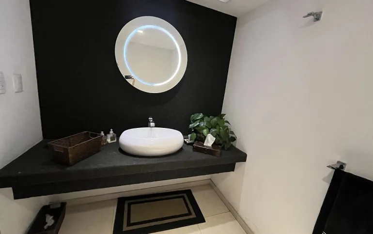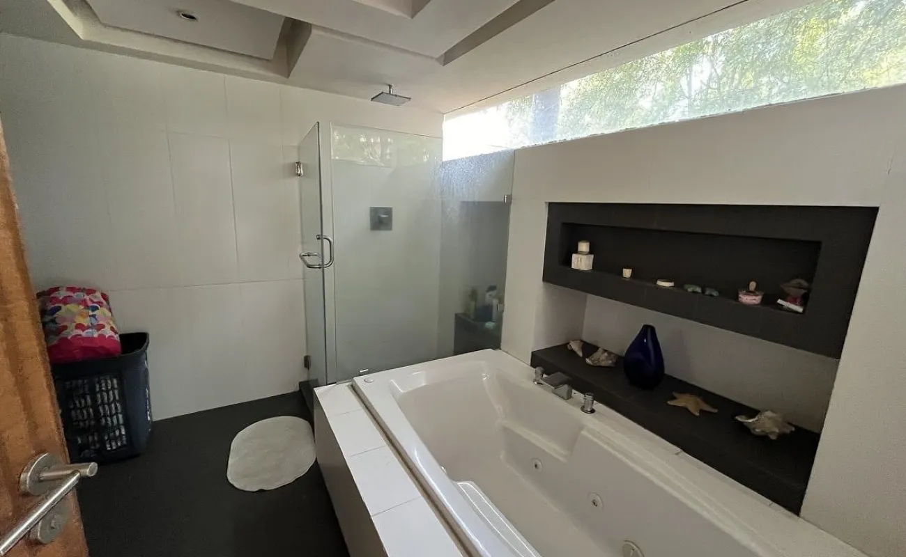 Abajo está la sala de TV y las 3 recámaras secundarias todas con terraza y 2 con baño completo y vestidor adentro de ellas y una más con baño completo afuera. En el área del jardín hay una terraza, fuente , jacuzzi para 12 personas. La parte de abajo es social y tiene cuarto de juegos, cuarto social, barra y cava así como 3 baños para mujeres y 3 de hombres con lavabo. Además de otras 2 terrazas una de ellas con chimenea y otra con una sombra espectacular que dan los enormes árboles del jardín.