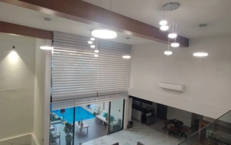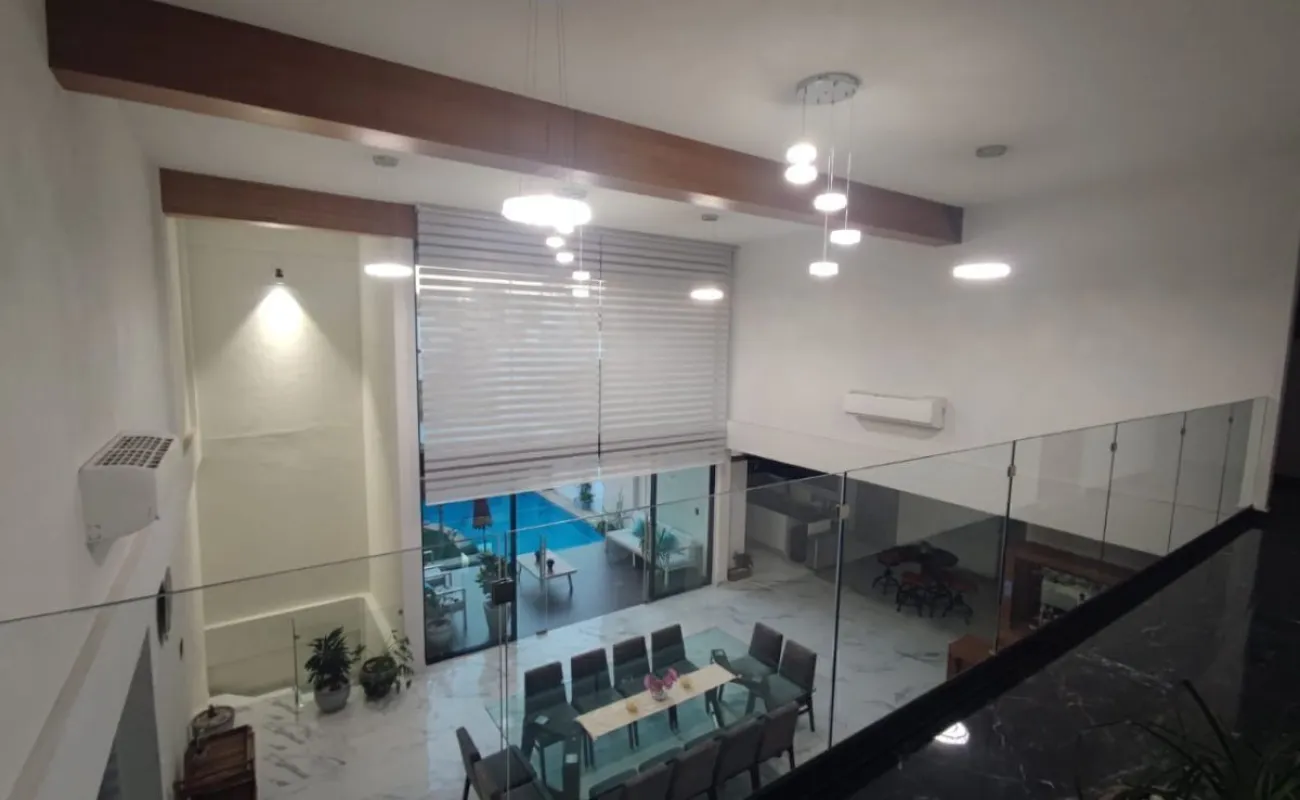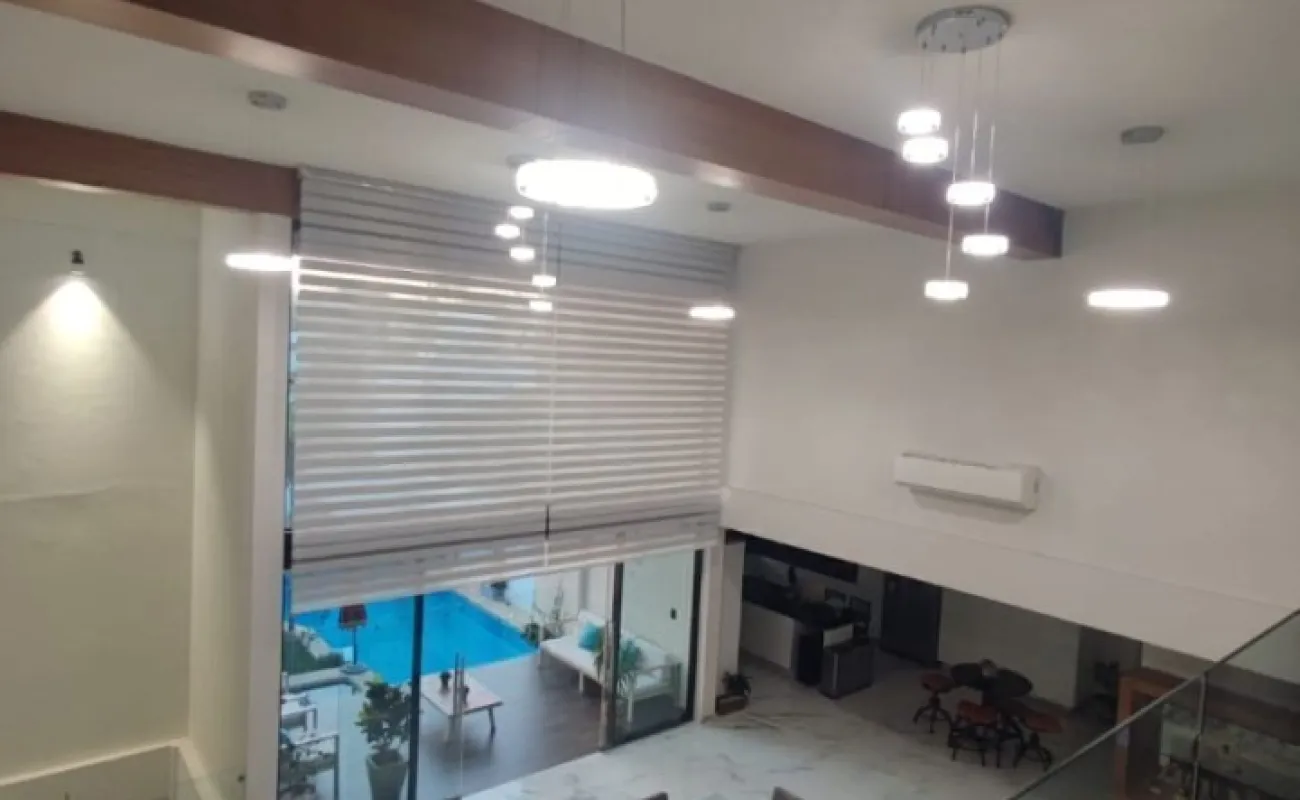 equipamiento con paneles solares para captación de luz, toda la residencia cuenta con aire acondicionado y cortinas con black out.