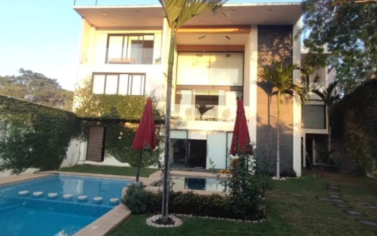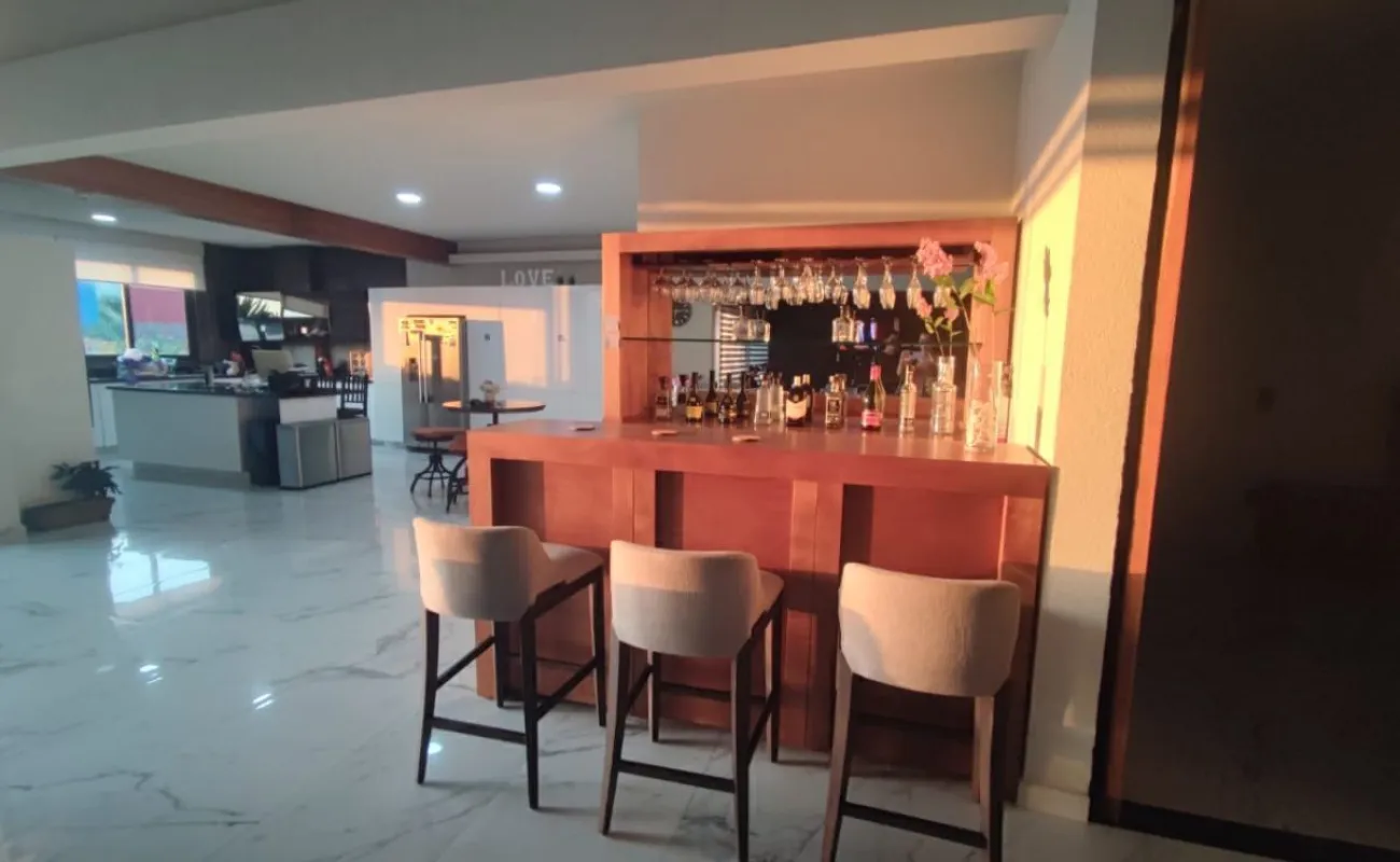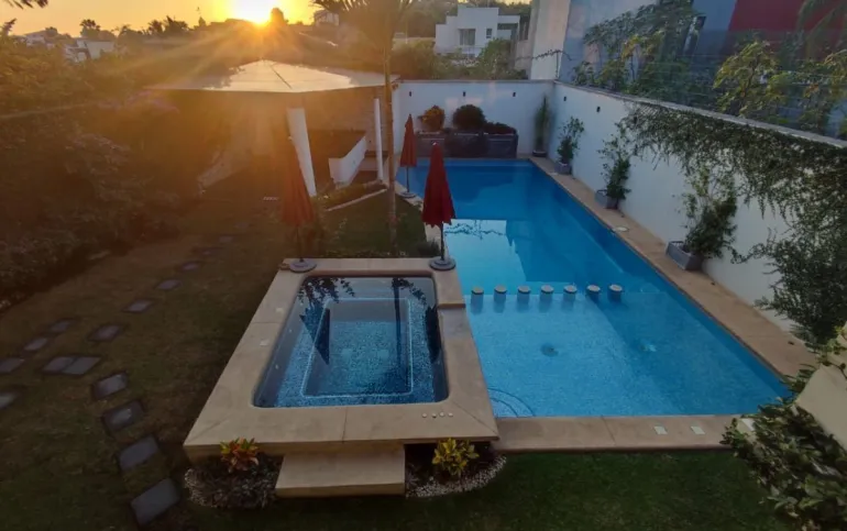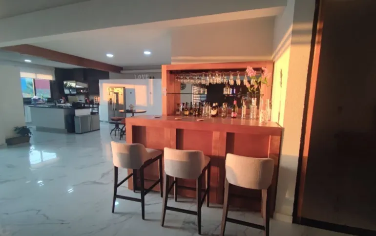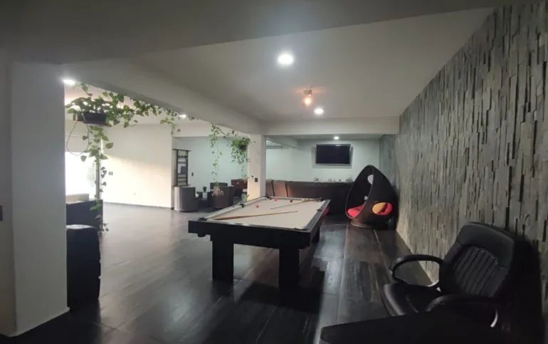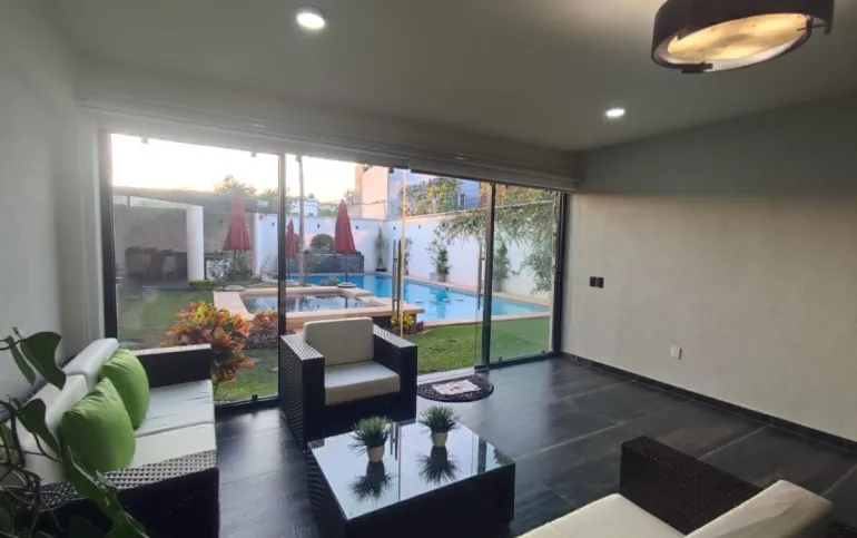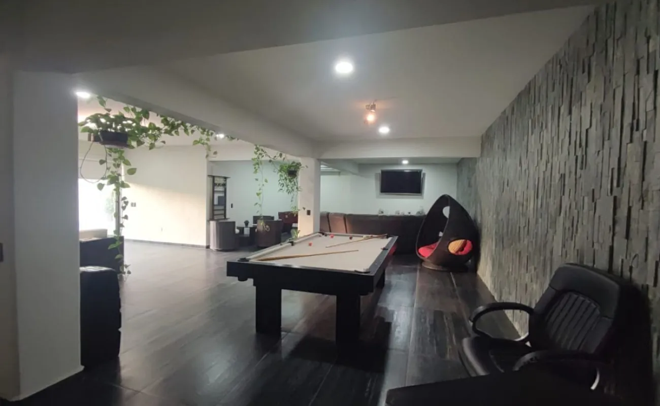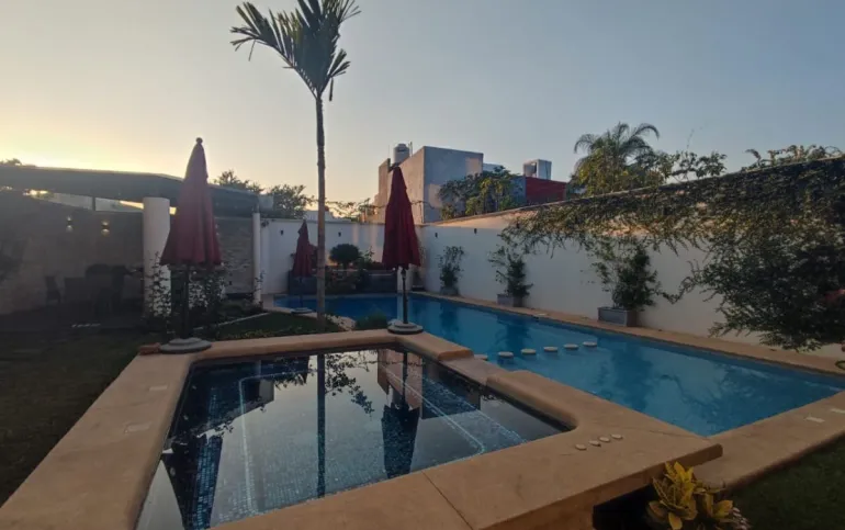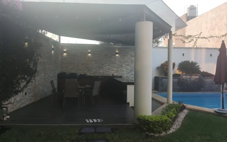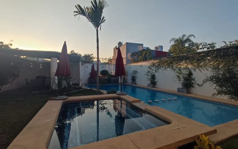 Alberca con caldera, fuente llorona, chapoteadero, jacuzzi, 2 regaderas exteriores, baño para mujeres y baño para hombres, sala de máquinas, palapa con asador, tarja y barra de granito, equipada.