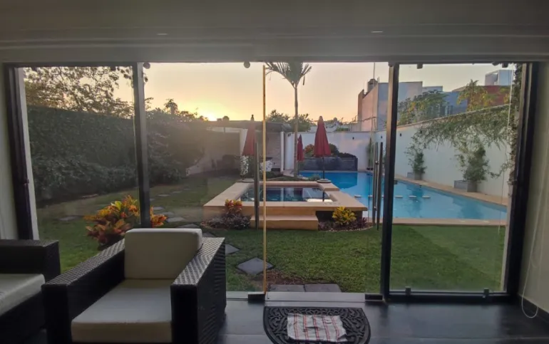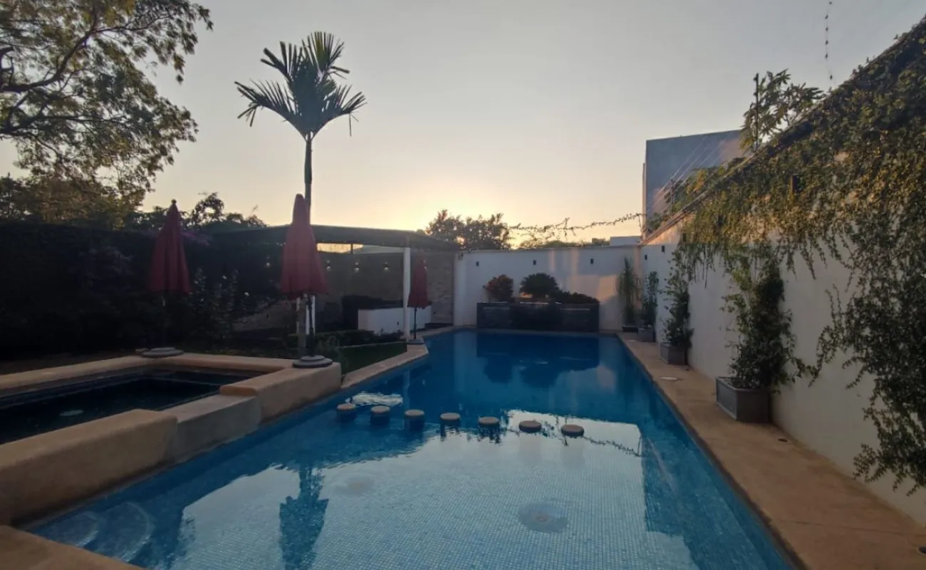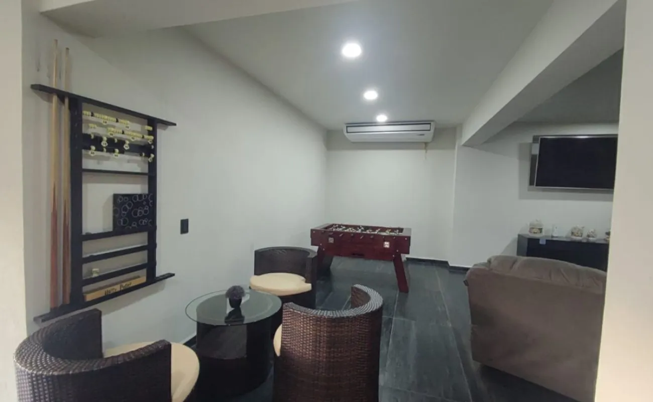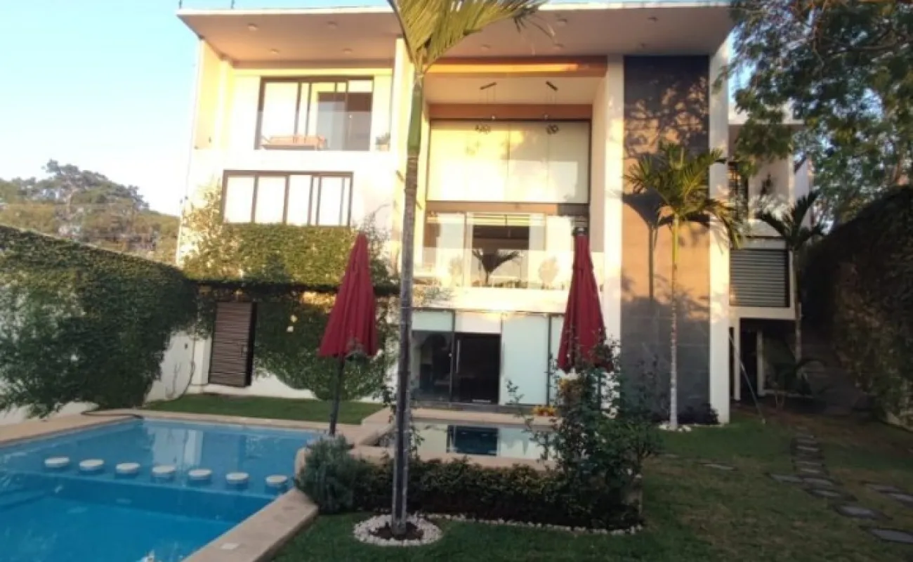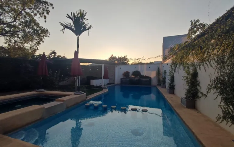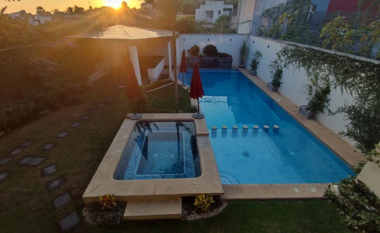 Alberca con caldera, fuente llorona, chapoteadero, jacuzzi, 2 regaderas exteriores, baño para mujeres y baño para hombres, sala de máquinas, palapa con asador, tarja y barra de granito, equipada.