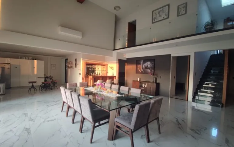 1er piso: comedor doble altura, sala, cocina con isla de granito, campana, antecomedor, terraza vista al jardín, cuarto de lavado, 4 recámaras cada una con baño completo, medio baño, closet de blancos, terraza interior