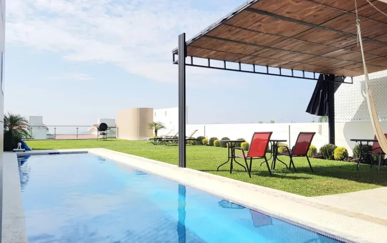 Casa club con alberca, chapoteadero, terraza para eventos, cancha de tenis, gym.