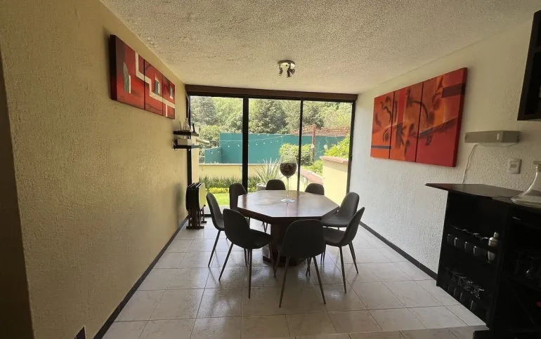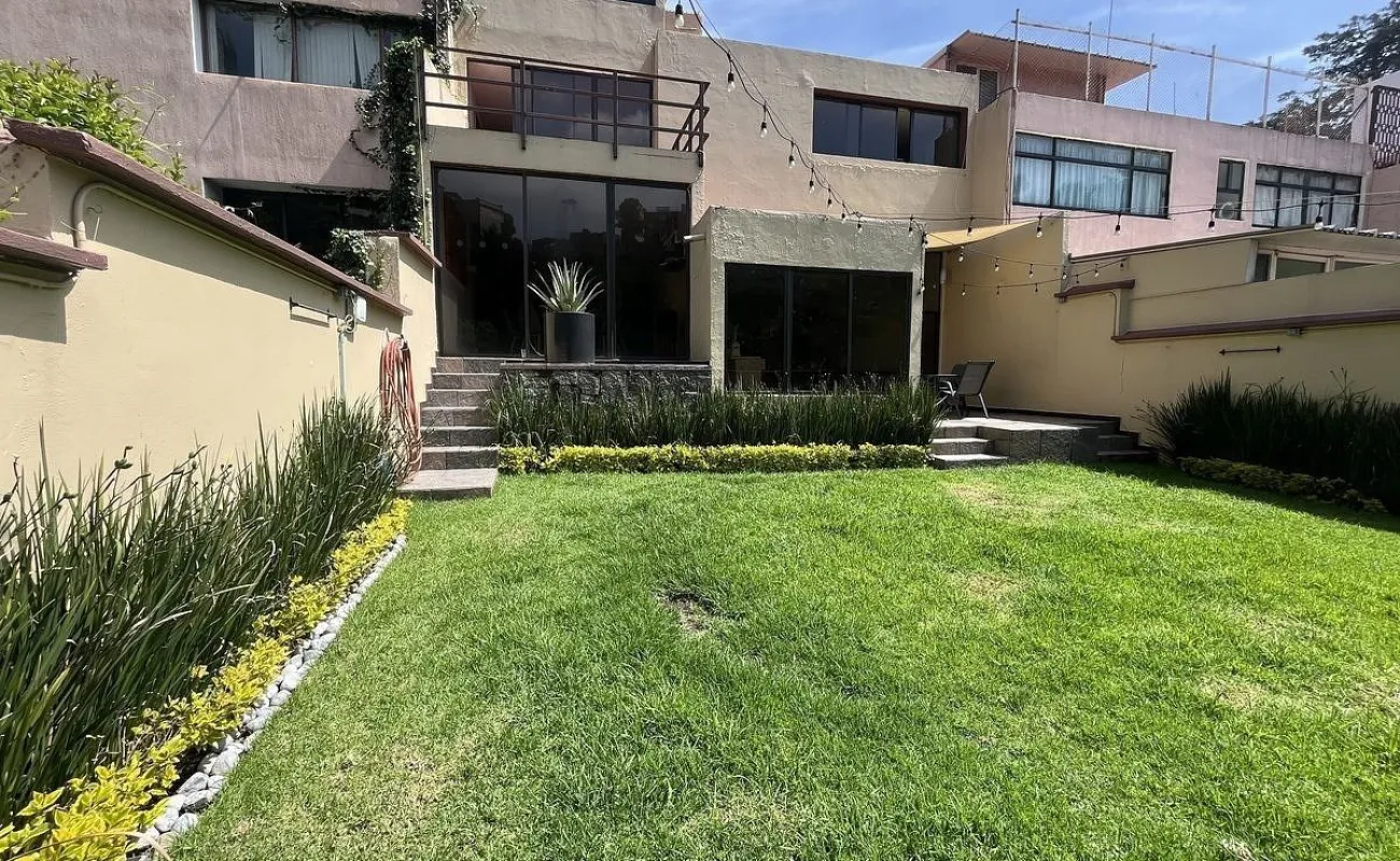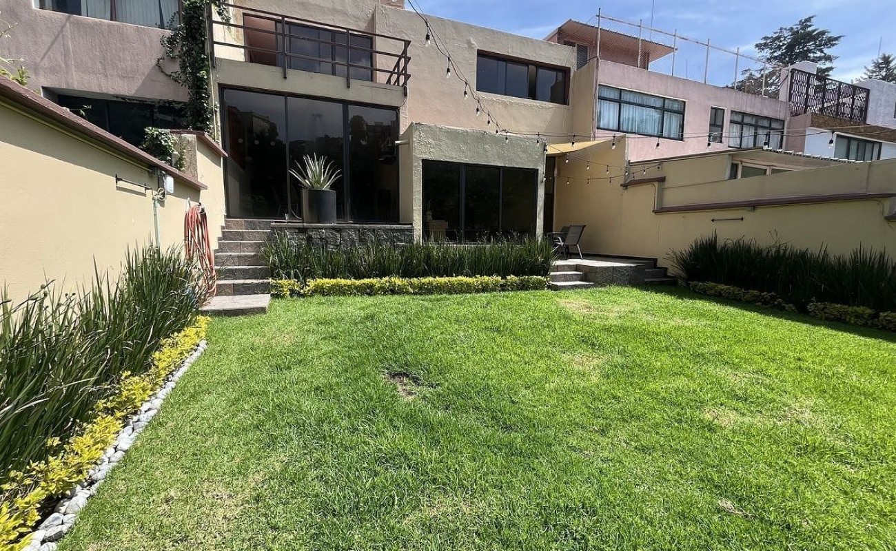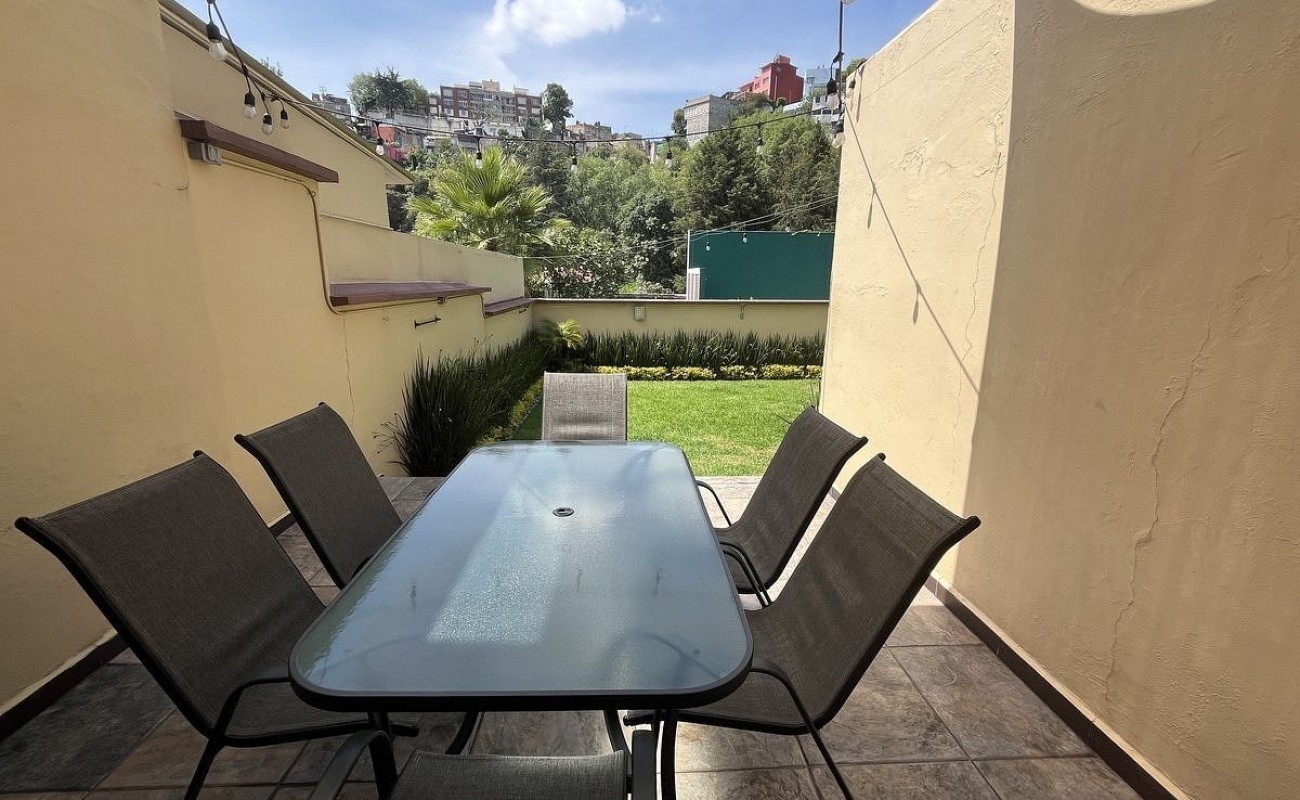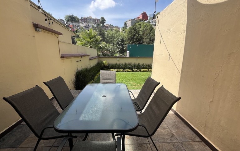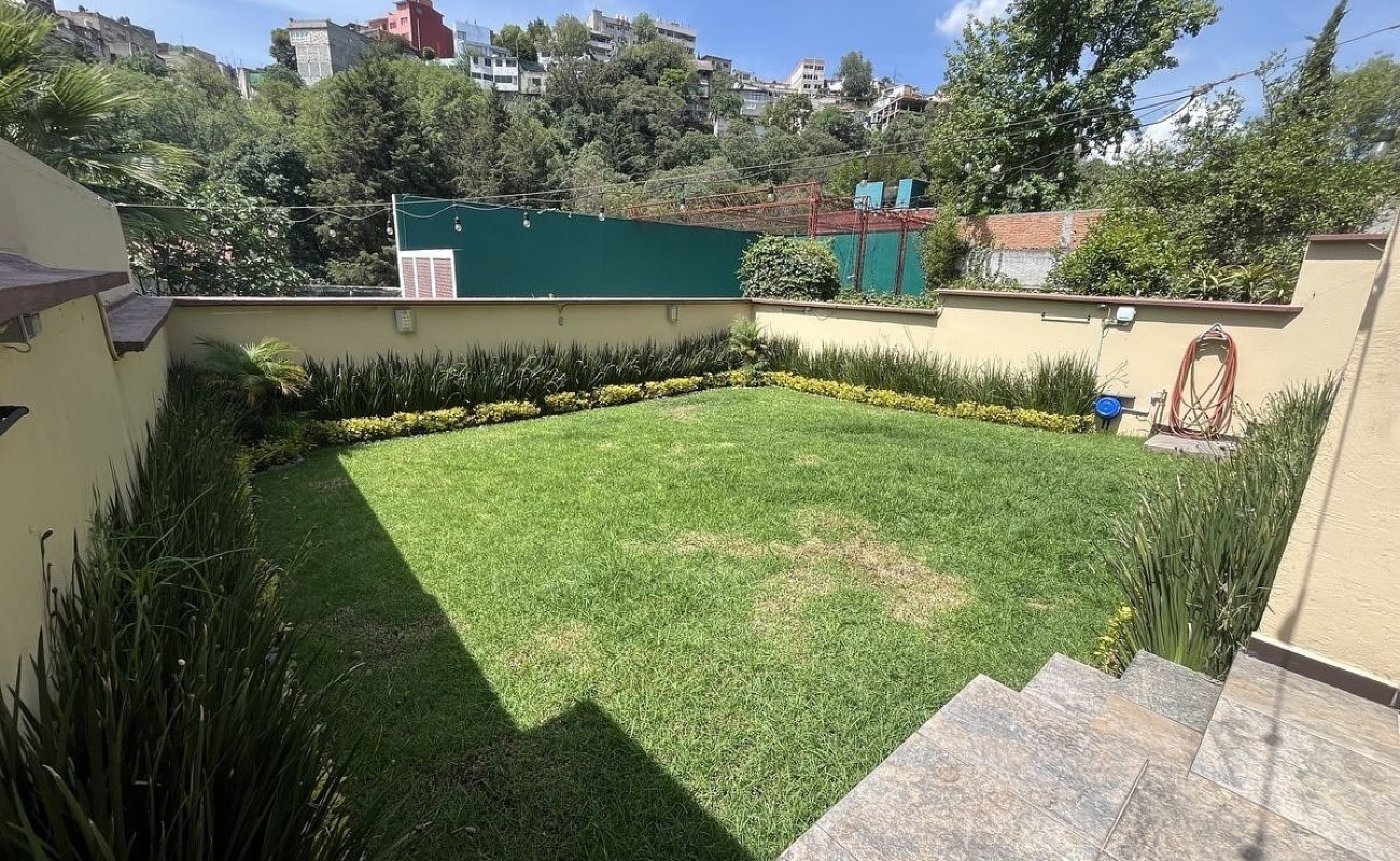 Toda la estancia da a un hermoso jardín plano y verde con sistema de riego con aspersores y de goteo de aproximadamente 90 m2 y una terraza de 20 m2 con vista arbolada. La cocina es hermosa y muy espaciosa con gran alacena y lugares de guardado así como lugar para ante comedor.