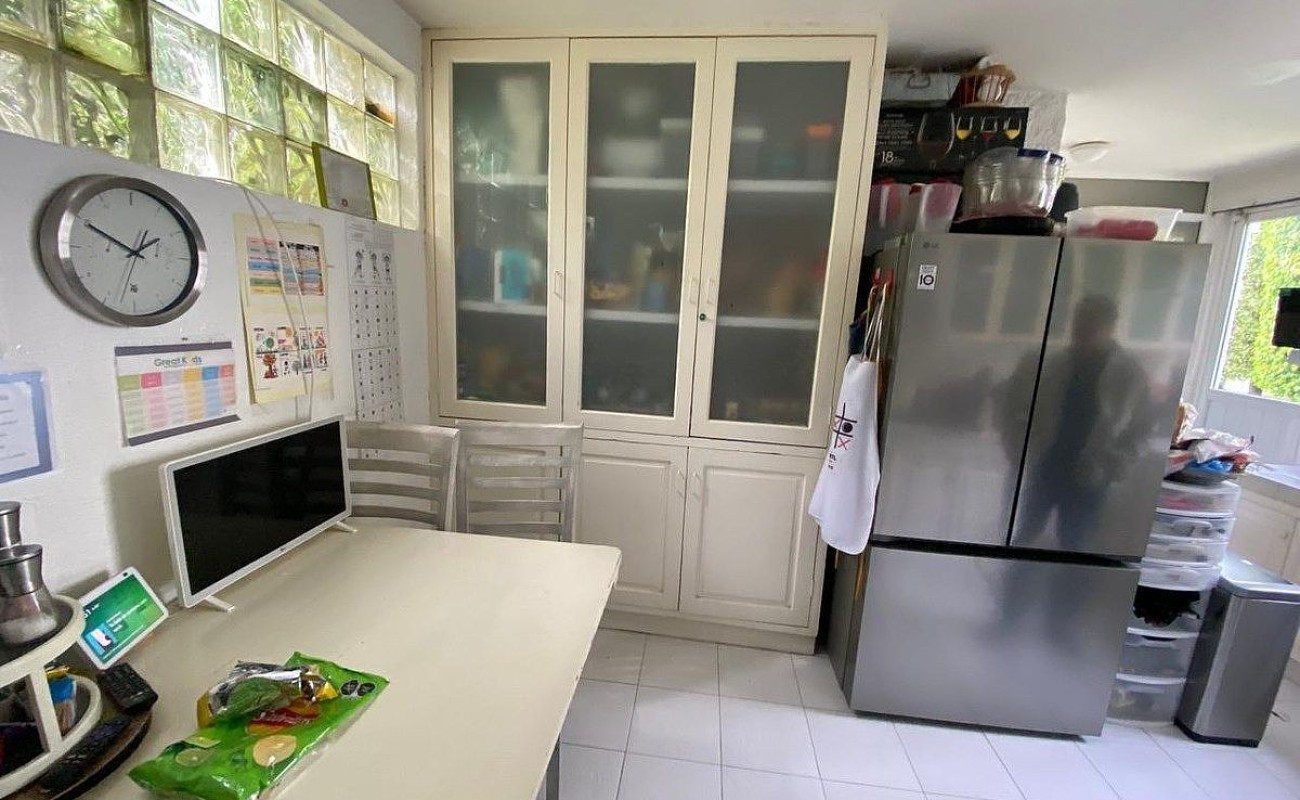 La cocina tiene vista al jardín, es muy iluminada con espacio para antecomedor y cuenta con alacena.