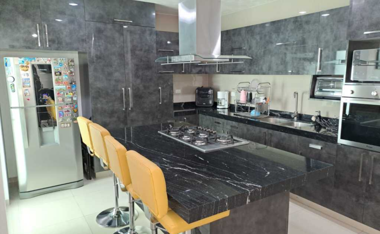 • Cocina equipada con cubierta e isla de mármol y torre de hornos.