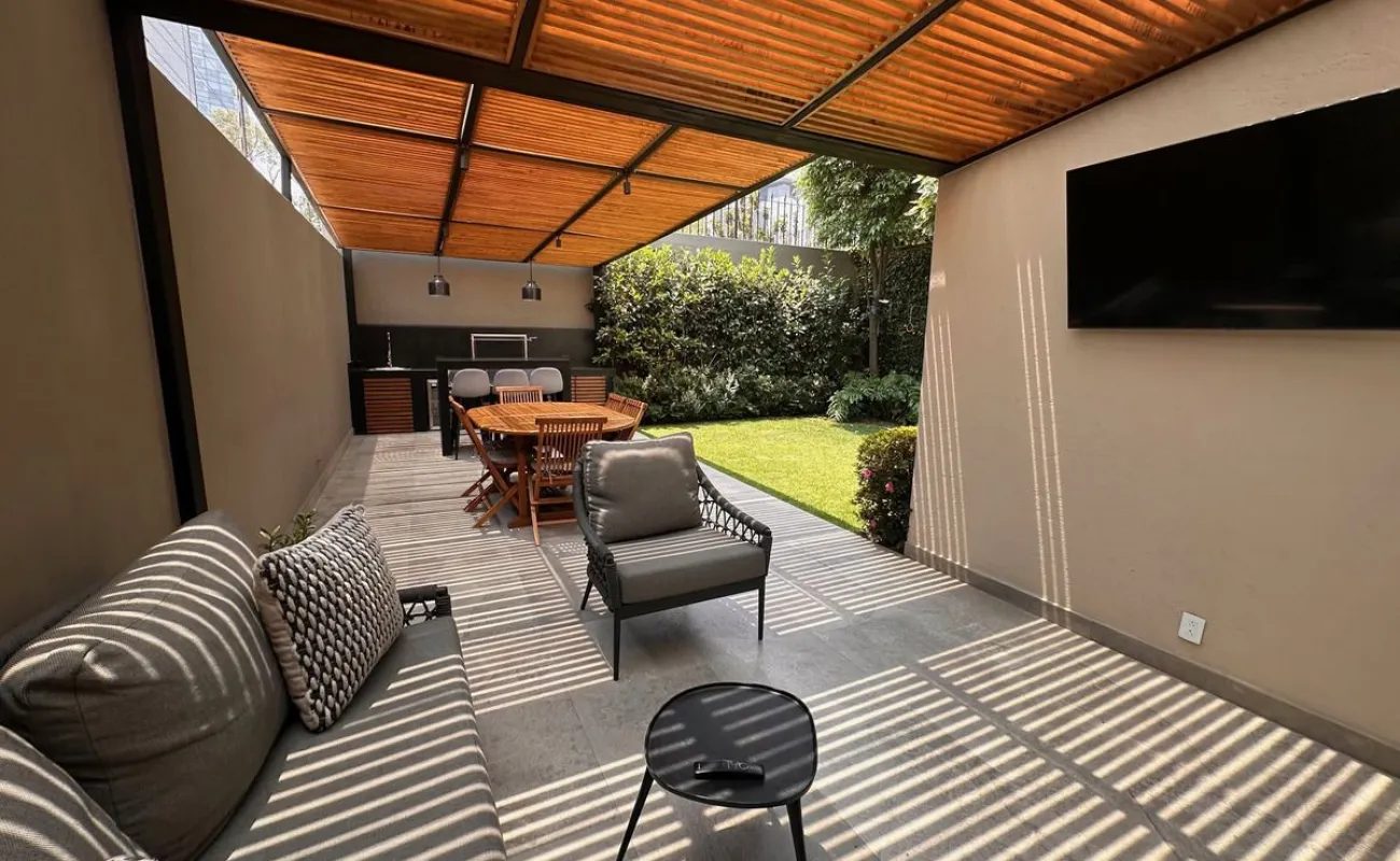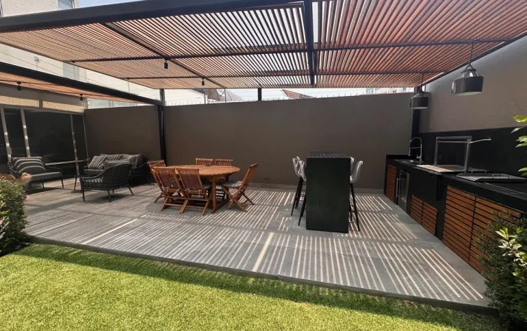 PB: recibidor, sala, comedor, family, estudio, cocina integral, baño de visitas. Terraza de 30 m2 con asador, barra y jardín de 25m2