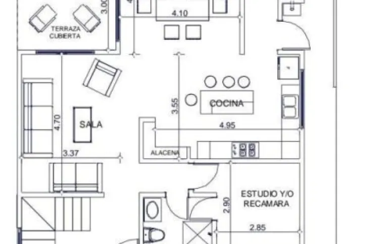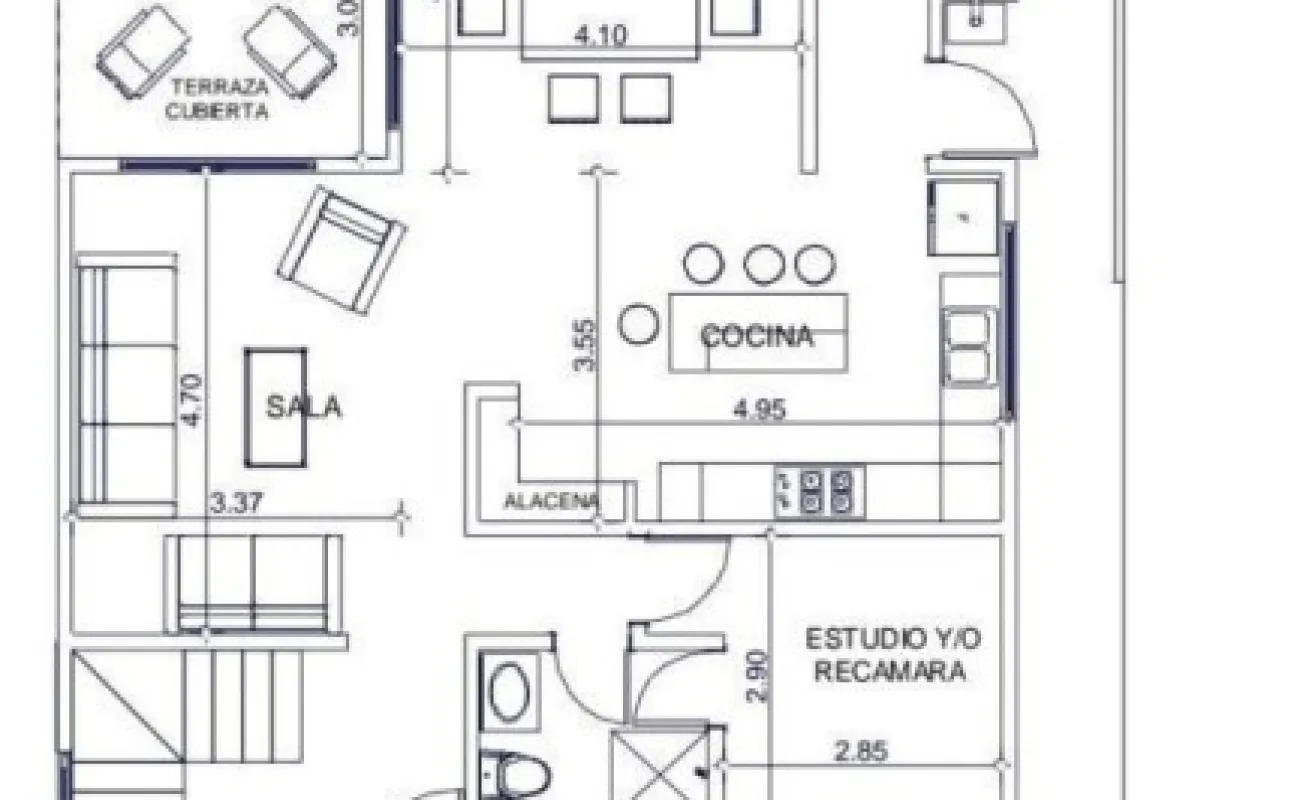 Sala,comedir, cocina integral, área de lavado, recamara o estudio con baño completo,tereaza, estaciinamiento dos autos.