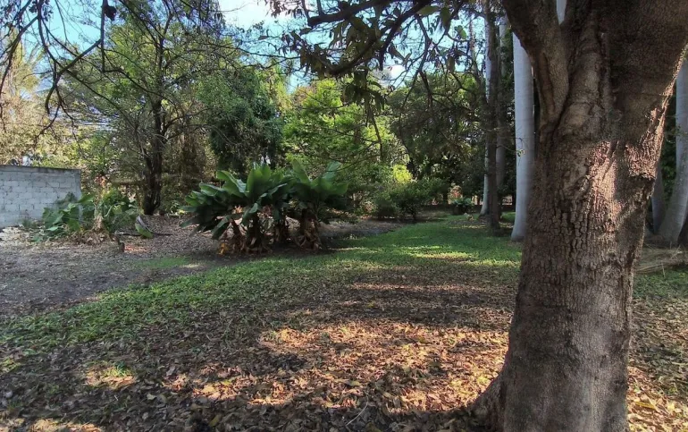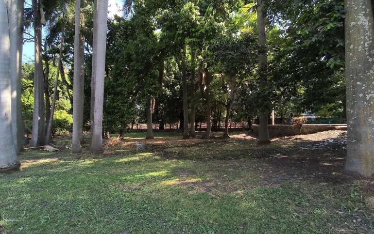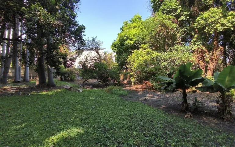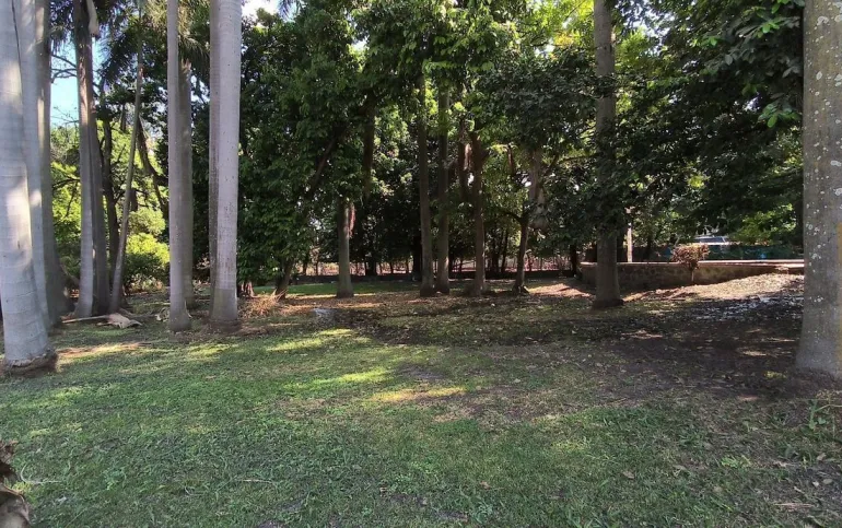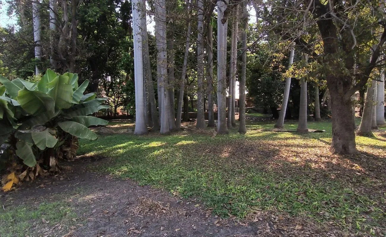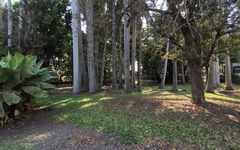 Enorme jardín dada la superficie y que la casa es pequeña, con palmas y lleno de árboles, algunos de estos frutales.
