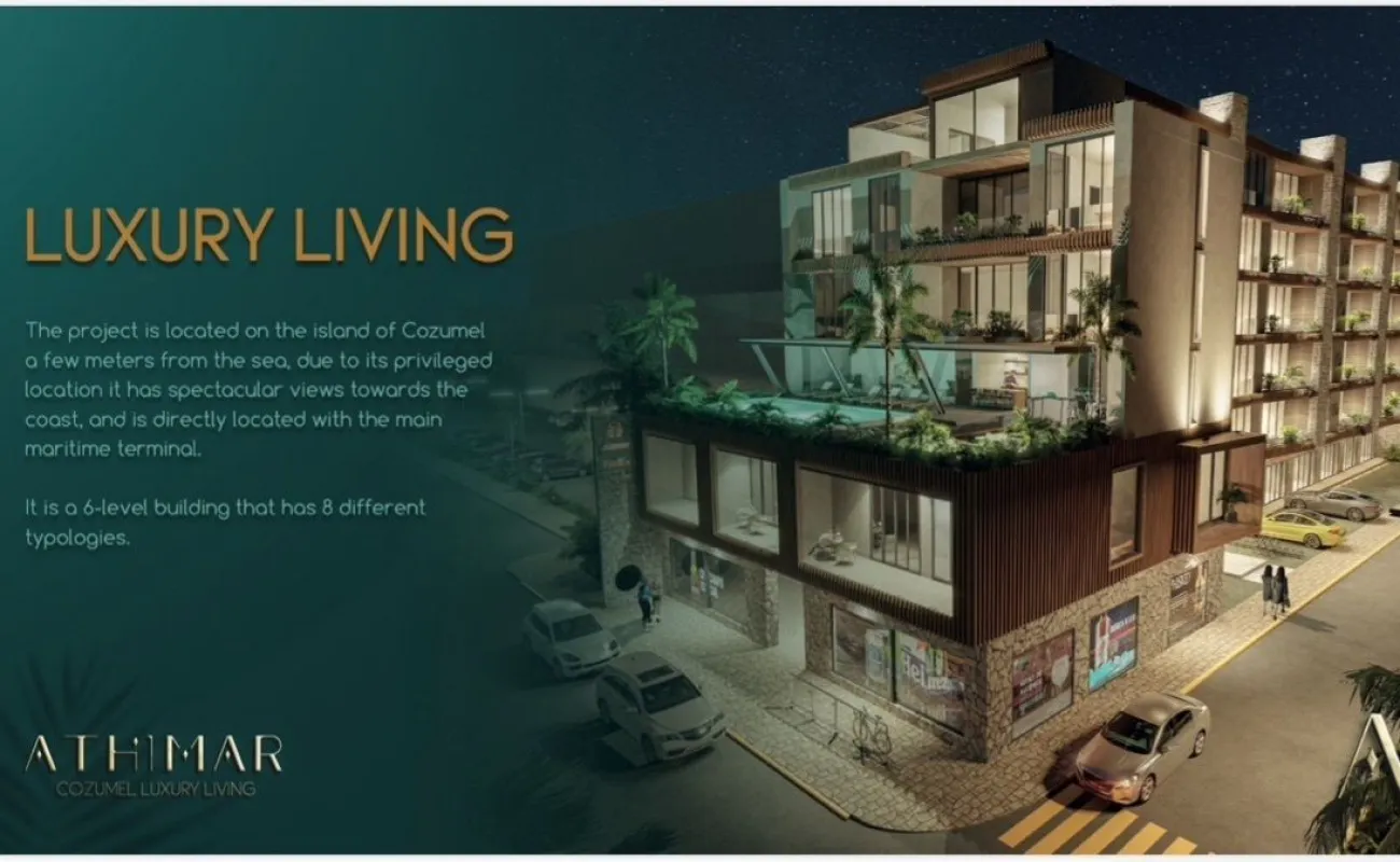 Desarrollo vertical de 25 departamentos de una, dos y tres recamaras, con 8 locales comerciales, ubicado en el corazon de Cozumel, en una de las zonas de mayor crecimiento y plusvalia de la Riviera Maya.