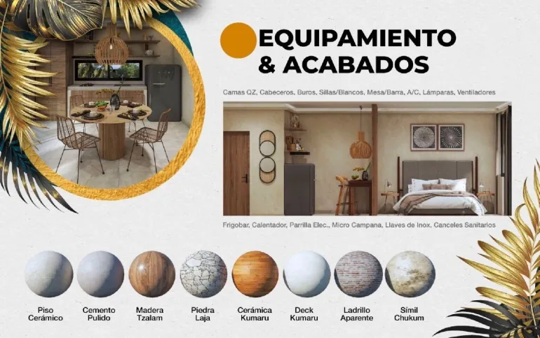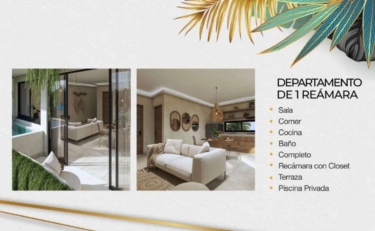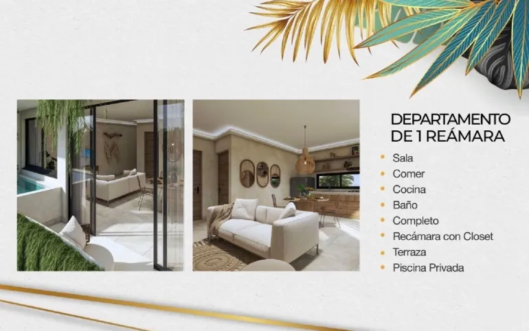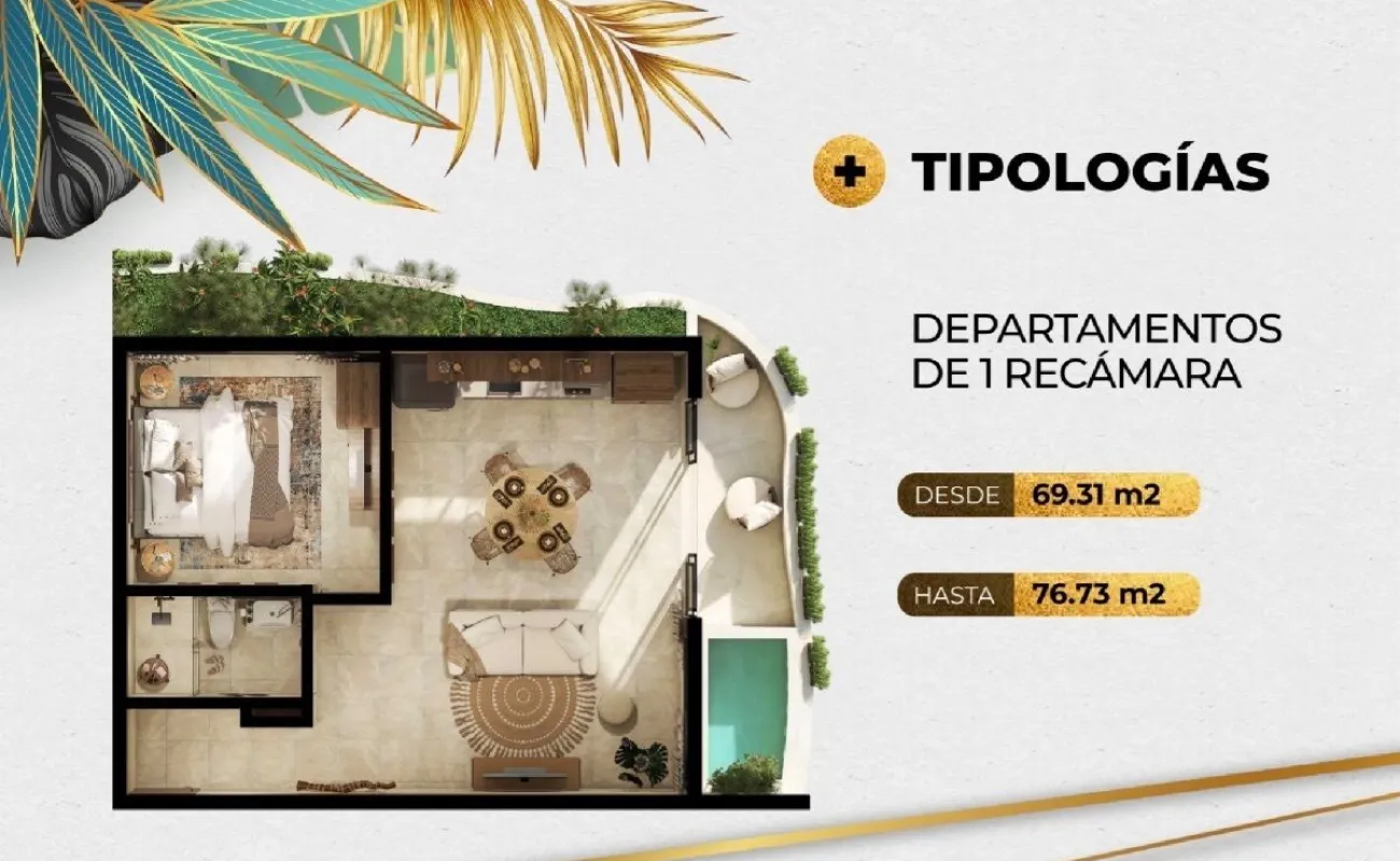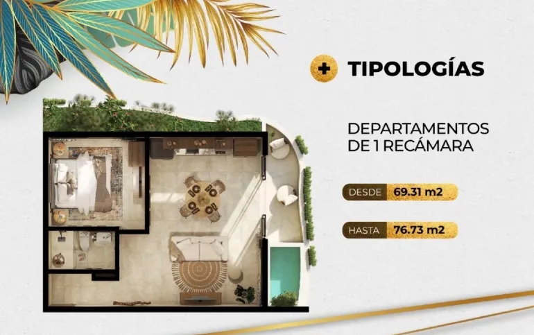 Contamos con tipologías estudio, de 1 y 2 recámaras con baño, desde 38.44m2 hasta 76.73m2, en diferentes formatos, *totalmente equipados, bajo esquemas desde el 50% de enganche se entregan amueblados y decorados, con llave en mano.