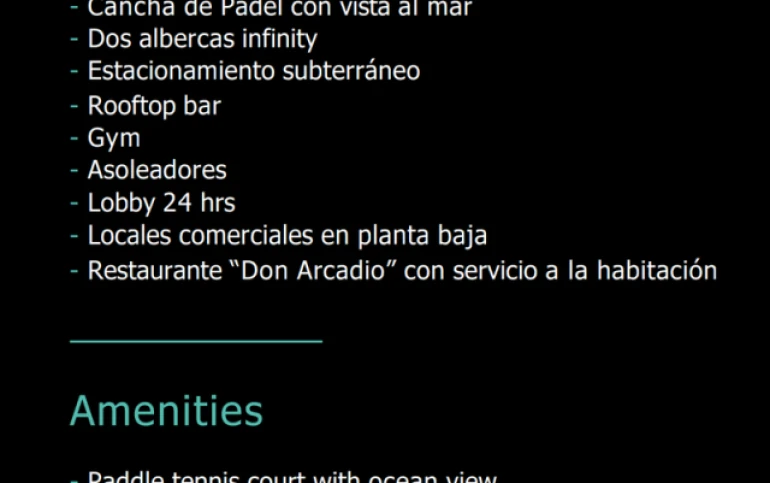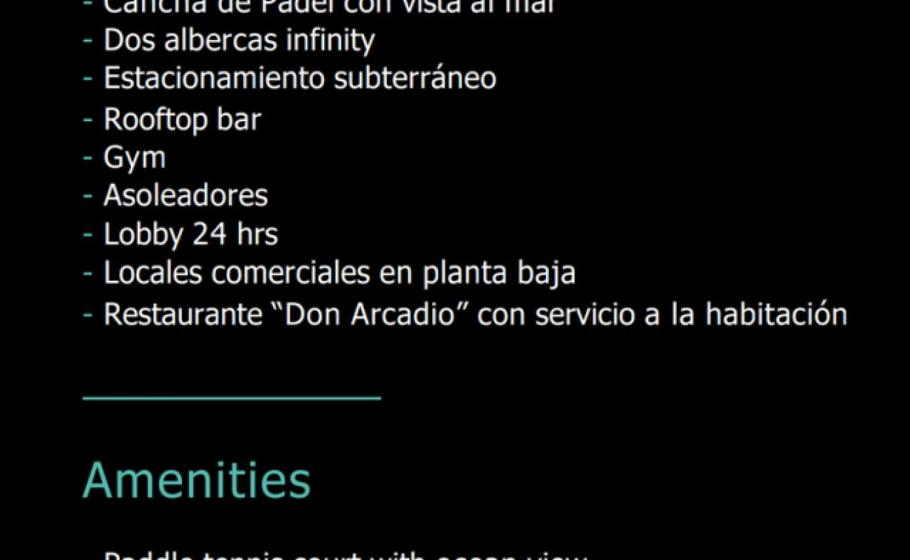 Cuenta con una gran cantidad de amenidades como cancha de Paddel con vista al mar, 2 Albercas Infinity, Rooftop Bar, Gym, etc., que harán de tu estancia en Playa del Carmen una experiencia inolvidable.
