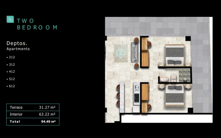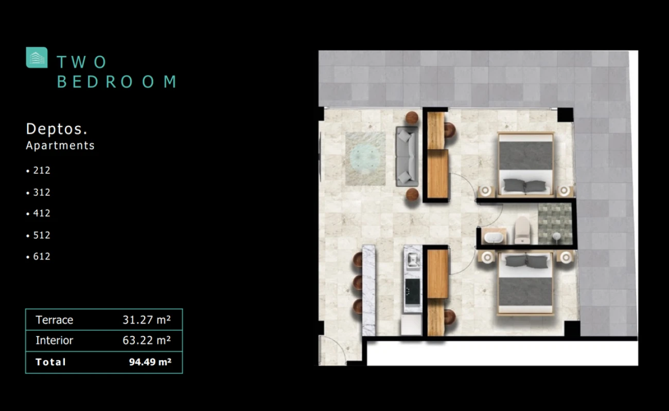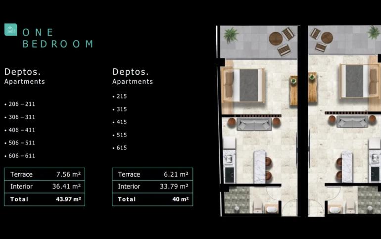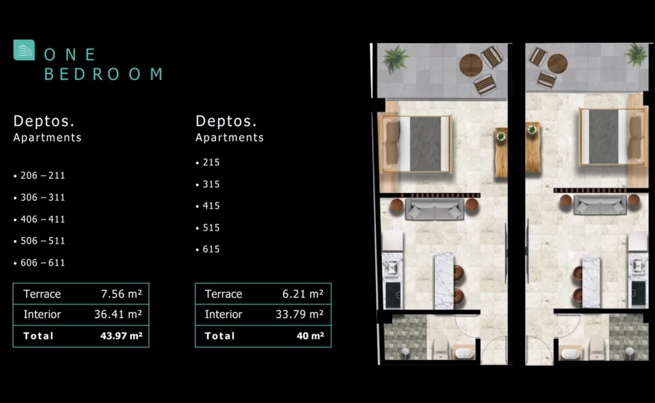 Contamos con unidades de 1 y 2 recámaras con baño, desde 39m2 hasta 76m2, en diferentes formatos, totalmente equipados, amueblados y decorados, se entregan con llave en mano.