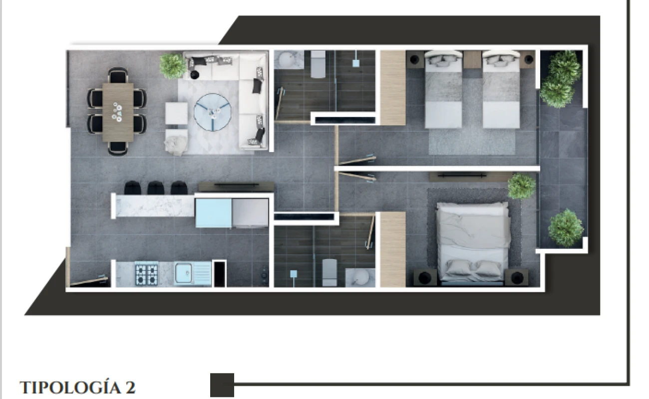 Con una distribución práctica y funcional, este departamento te ofrece una excelente oportunidad para tener tu propio espacio en la ciudad. Las habitaciones son cómodas y luminosas, con acabados modernos y de alta calidad.