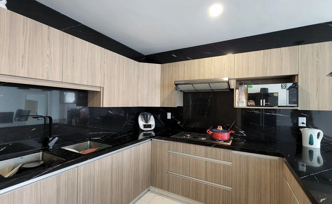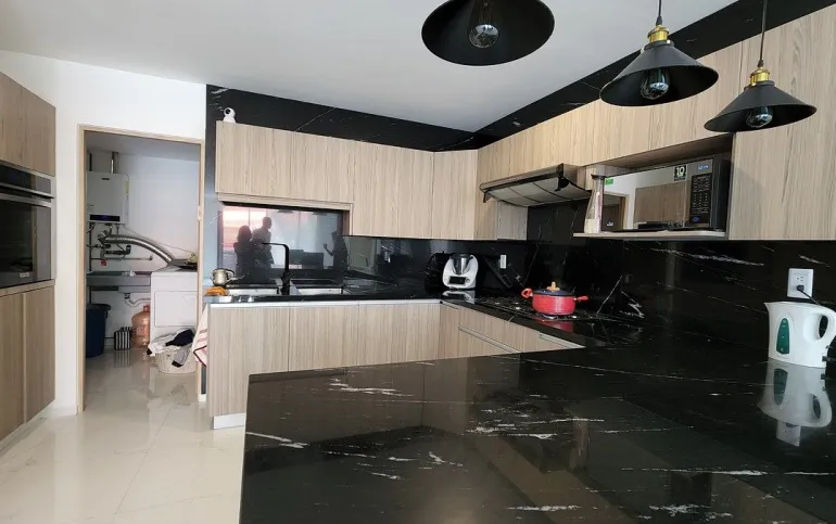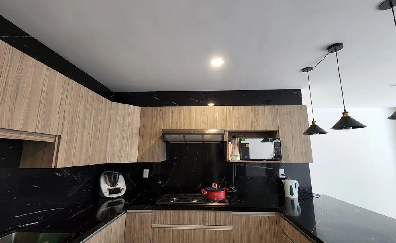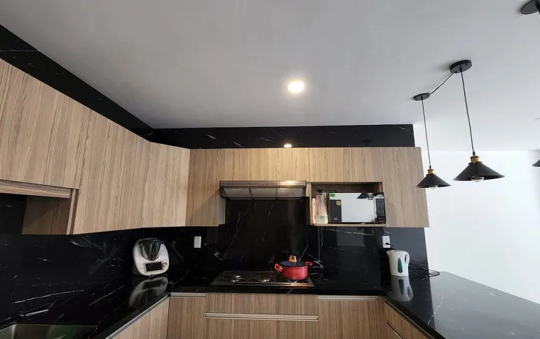 - sala-comedor con balcón, cocina integral con barra de granito y con alacena, cuarto de servicio y área de lavado.