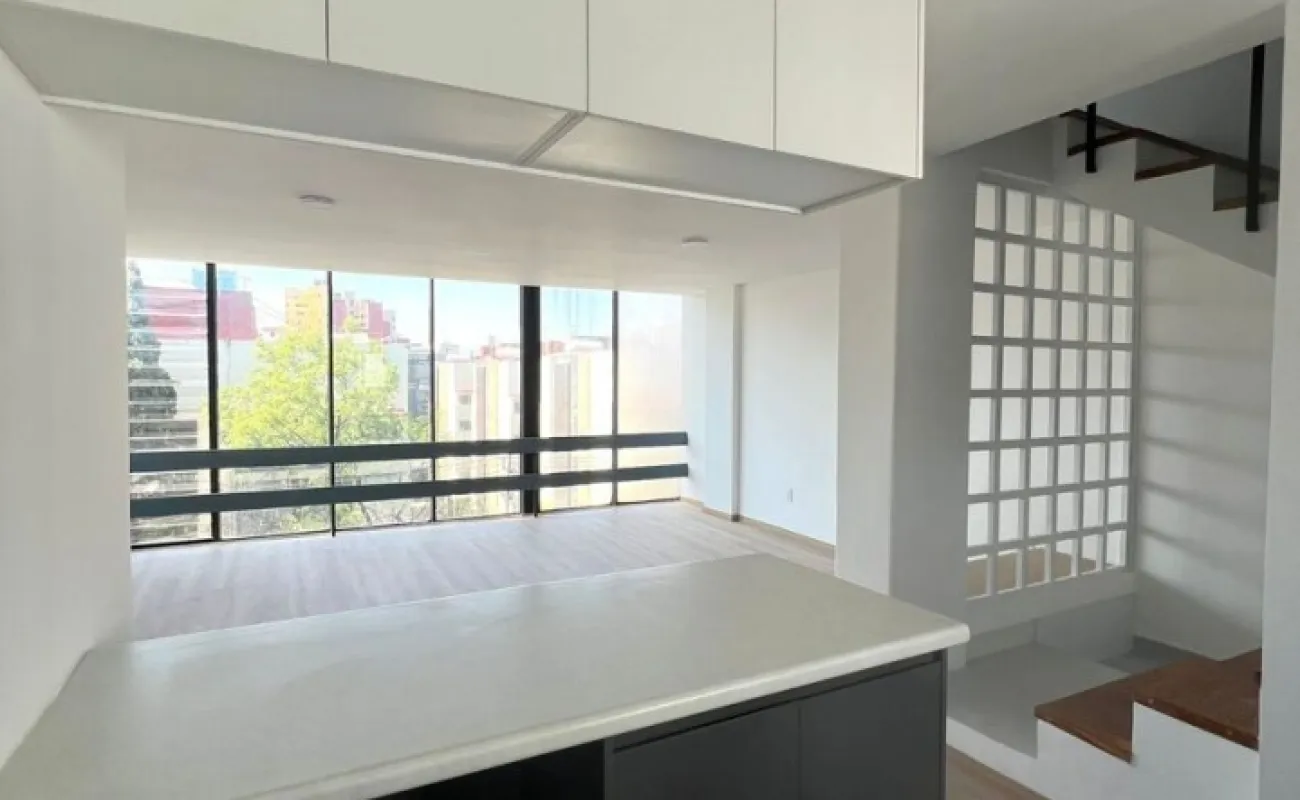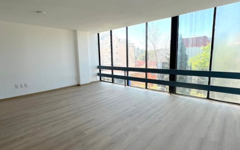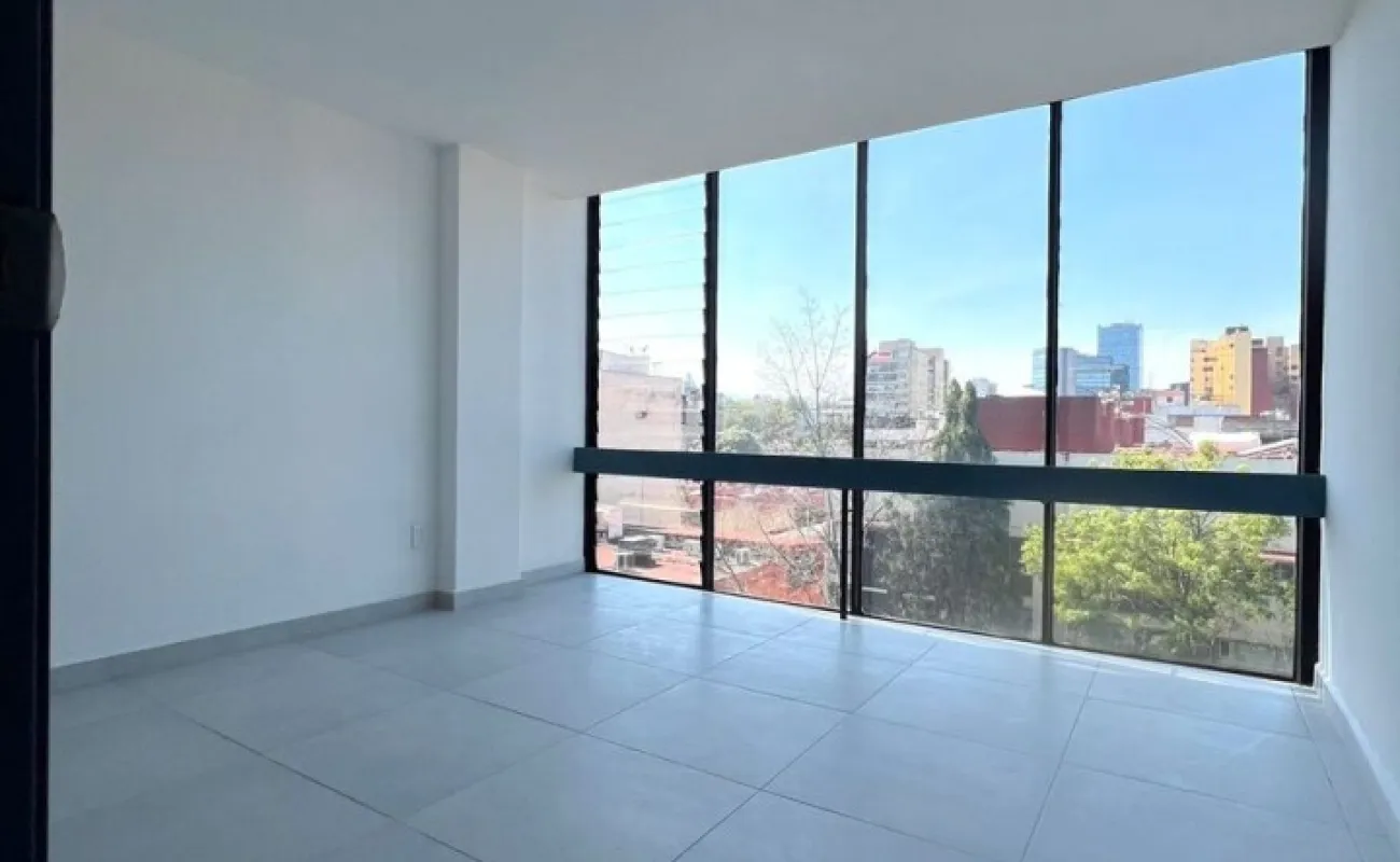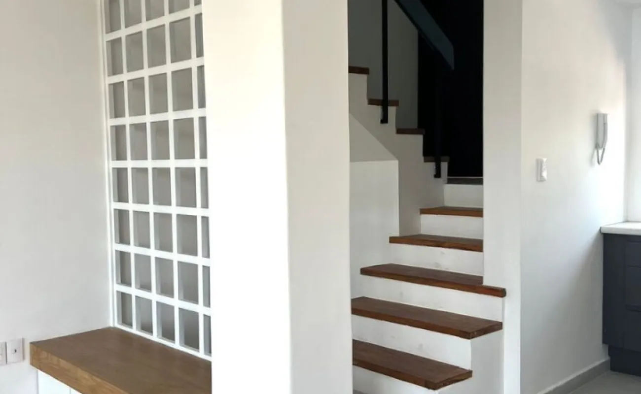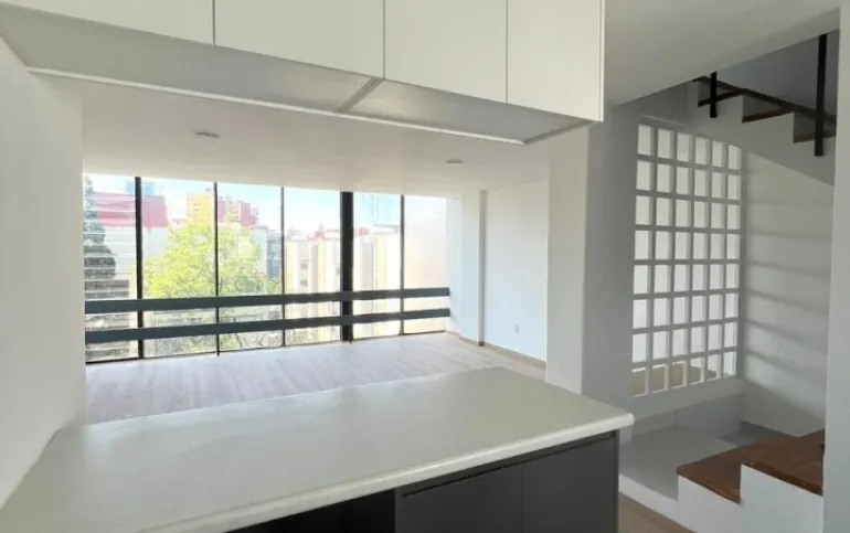 Consta de dos pisos. Hall de doble altura, medio piso hacia abajo: estancia y comedor con ventanales hacia Av. Coyoacán, cocina abierta, área para lavadora. Planta alta: dos recámaras con clóset que comparten baño completo.