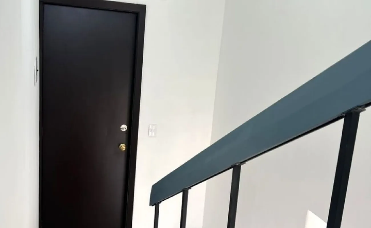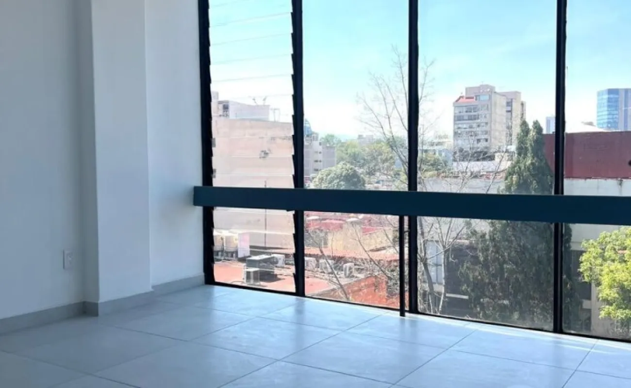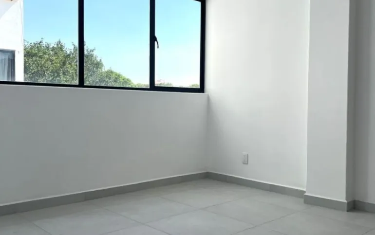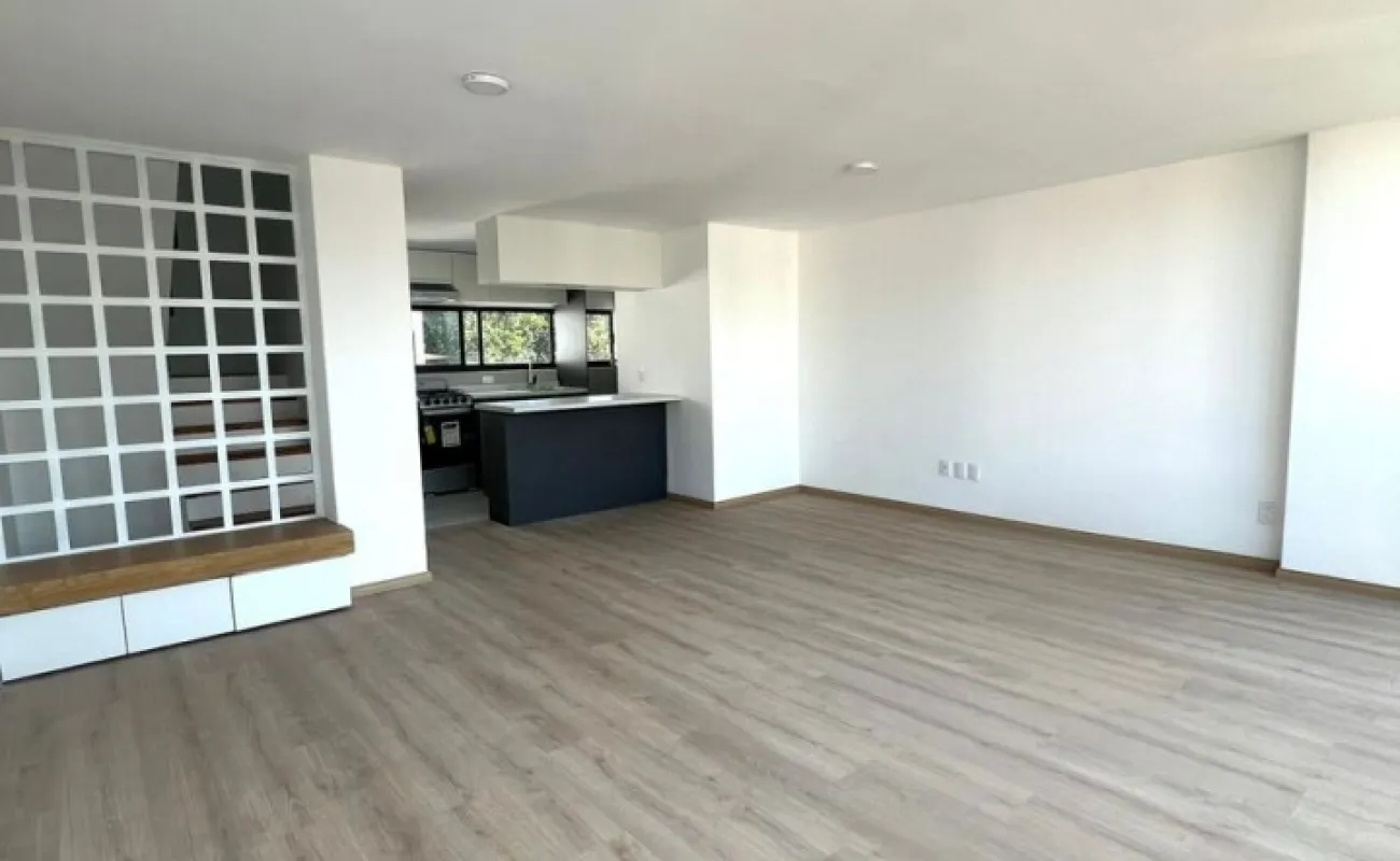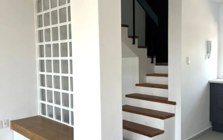 Consta de dos pisos. Hall de doble altura, medio piso hacia abajo: estancia y comedor con ventanales hacia Av. Coyoacán, cocina abierta, área para lavadora. Planta alta: dos recámaras con clóset que comparten baño completo.