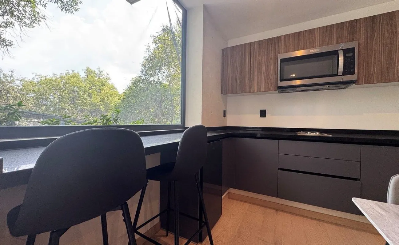 Cuenta con 1 recámara con clóset, 1 baño completo y cocina integral equipada, cuenta con excelentes acabados, Disfruta de un balcón y terraza con asador, perfectos para relajarte.