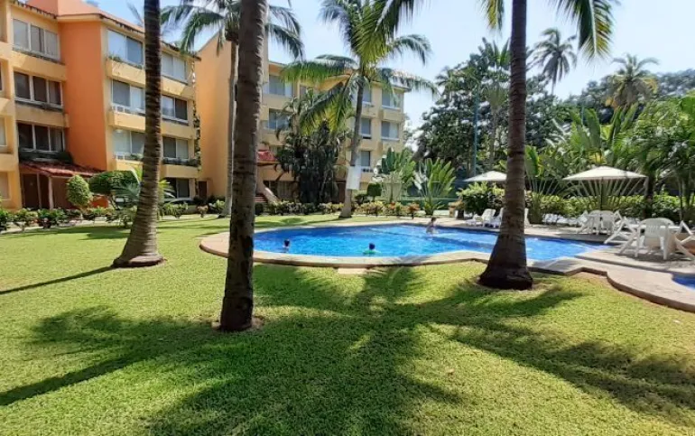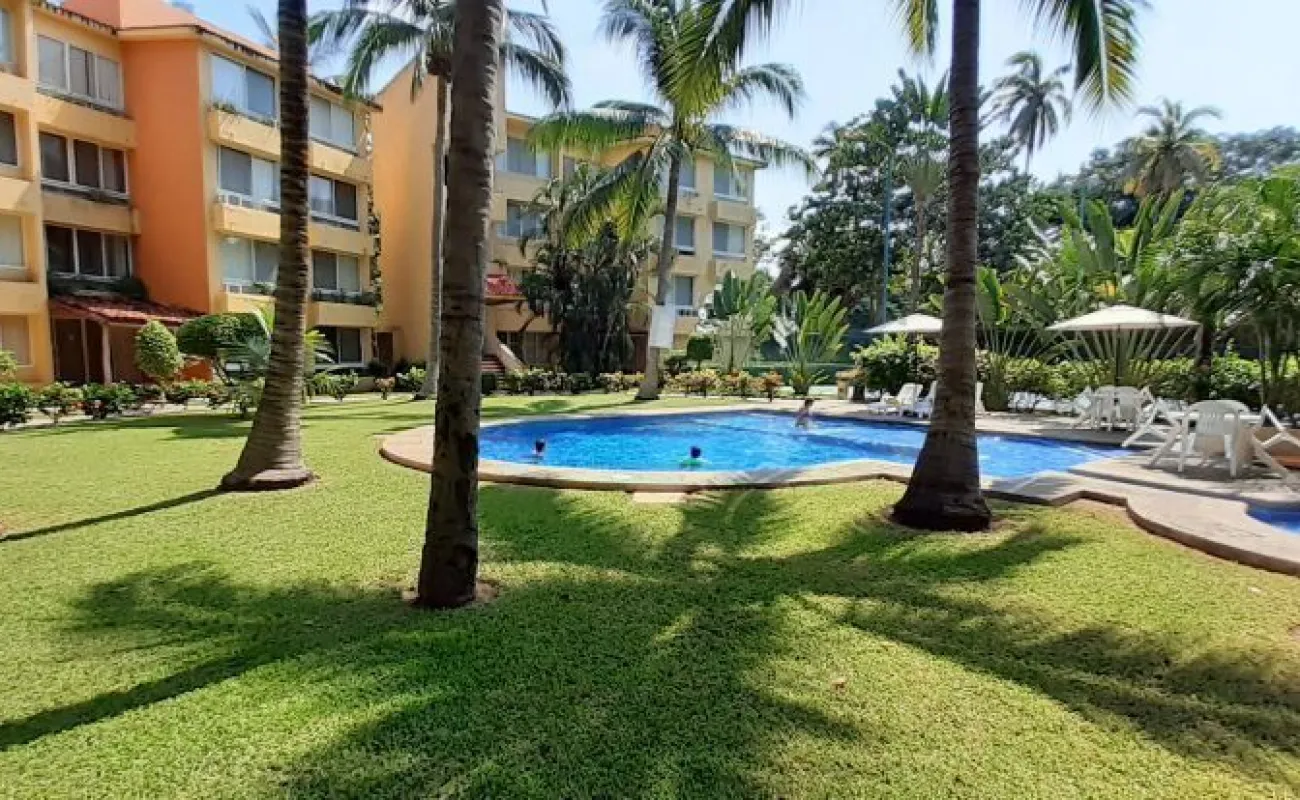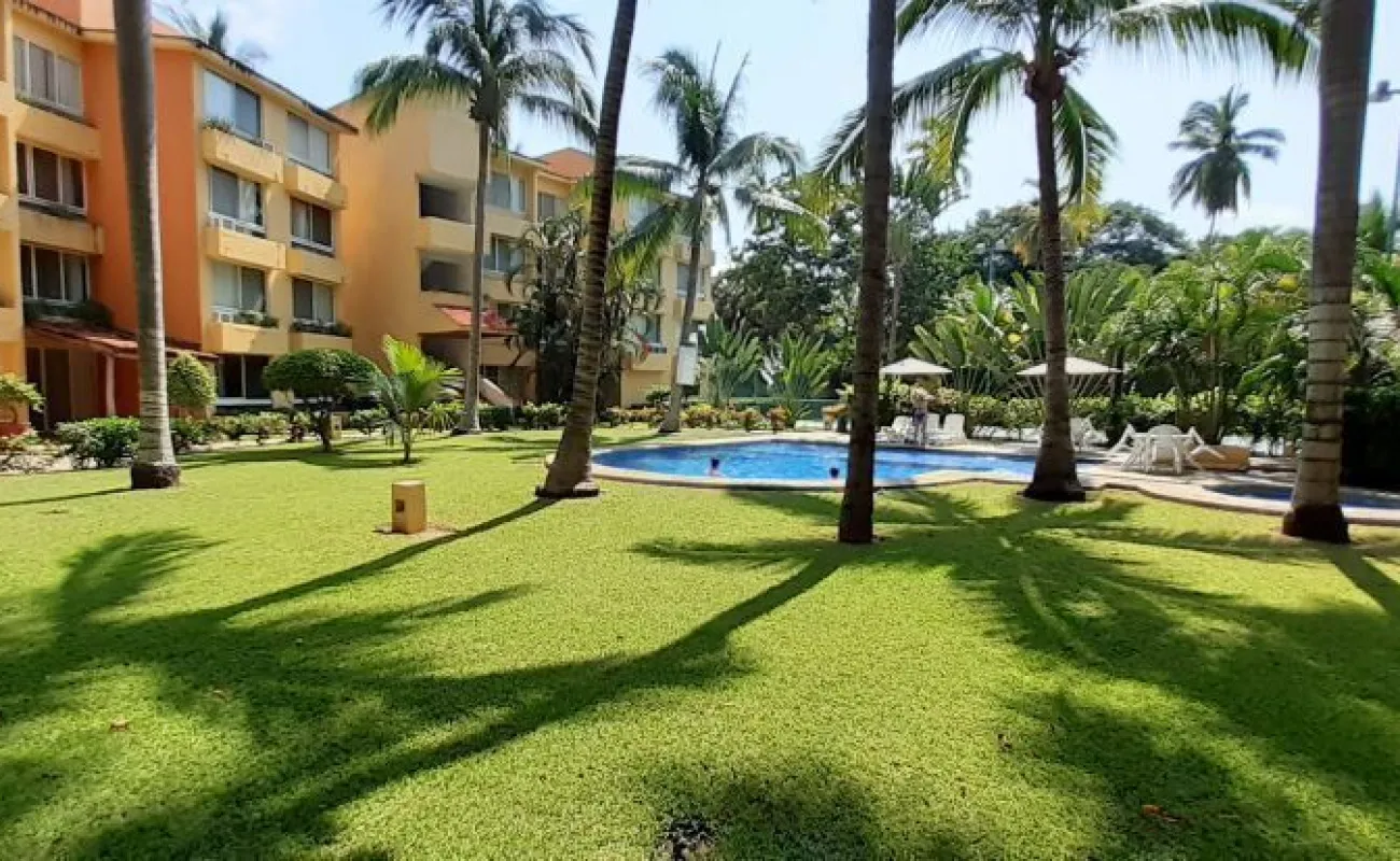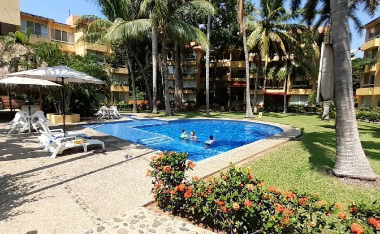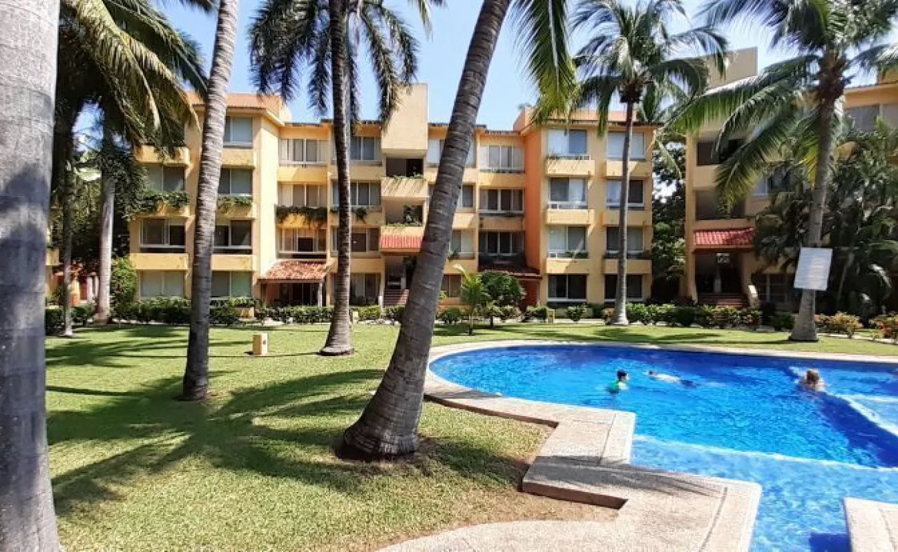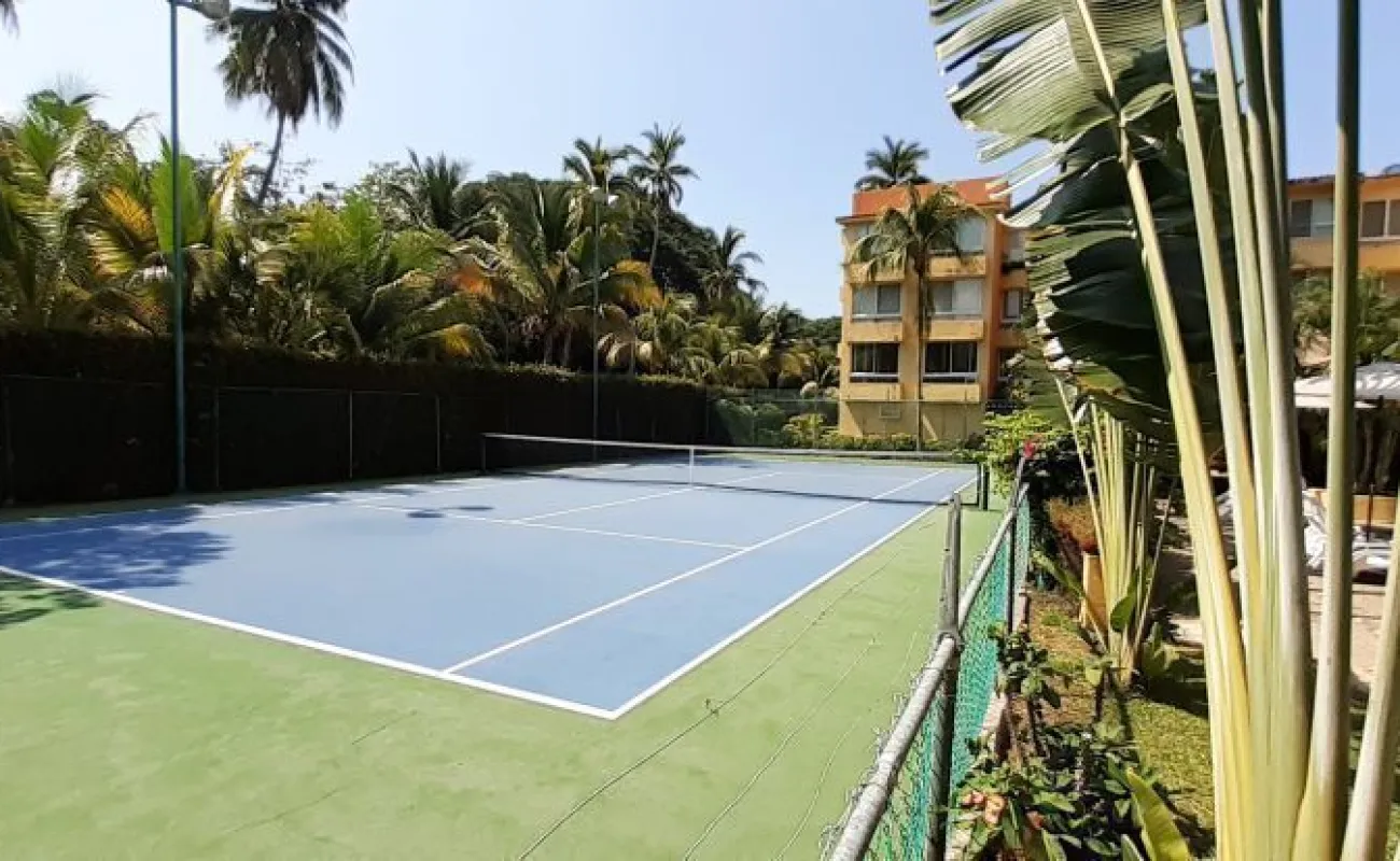 Vendo departamento en condominio con alberca, jardín y cancha de tenis, en Ixtapa, Zihuatanejo, Gro. Departamento de 120 m2, en primer piso. Estancia sala-comedor con A/A minisplit y vista a la alberca, cocina integral abierta con barra, recámara principal con closet, baño, A/A minisplit y vista a la alberca, al jardín y a la cancha de tenis, baño de visitas completo (compartido con la 1a. recámara junior), 1a. recámara junior con closet, baño, A/A minisplit y vista al jardín trasero, 2a. recámara junior con closet y vista a la alberca, cuarto de lavado integrado con baño completo, un cajón de estacionamiento independiente, en condominio de 28 departamentos, amplio jardín interior con espectaculares palmeras, hermosa alberca con chapoteadero, palapa con tarja, cancha de tenis, caseta de vigilancia con portero 24 horas. El condominio cuenta con impecable administración externa, servicio de limpieza y lavado de blancos. El condominio está ubicado a 4 minutos de los hoteles Barceló Ixtapa y Pacífica Resort Ixtapa, a 2 minutos del Campo de Golf Ixtapa, a 8 minutos de Marina Ixtapa y de Naútica Golf Course. Ixtapa se localiza a 15 km de Zihuatanejo. Ixtapa y Zihuatanejo se distinguen por sus hermosas playas (La Ropa, Las Gatas, Playa Quieta, El Palmar, La Isla, etc.). Ixtapa está ubicado en 2.5 horas de la hermosa ciudad de Morelia, Mich.