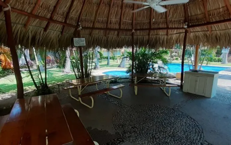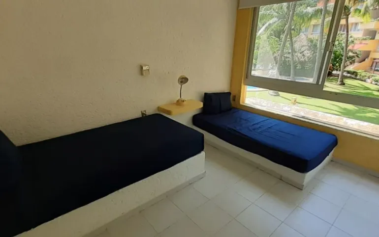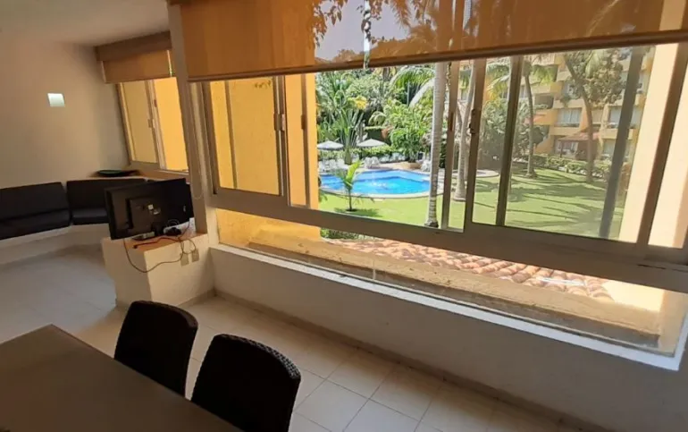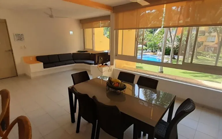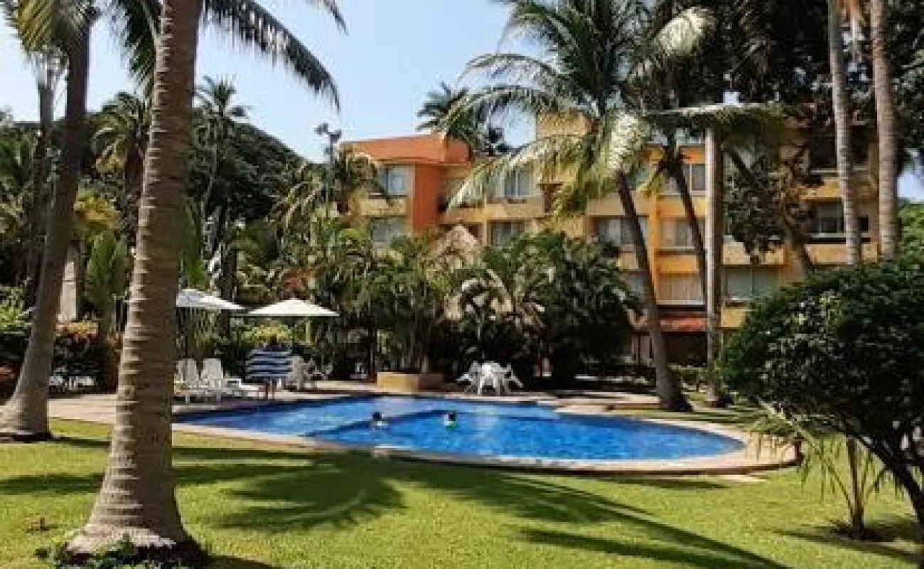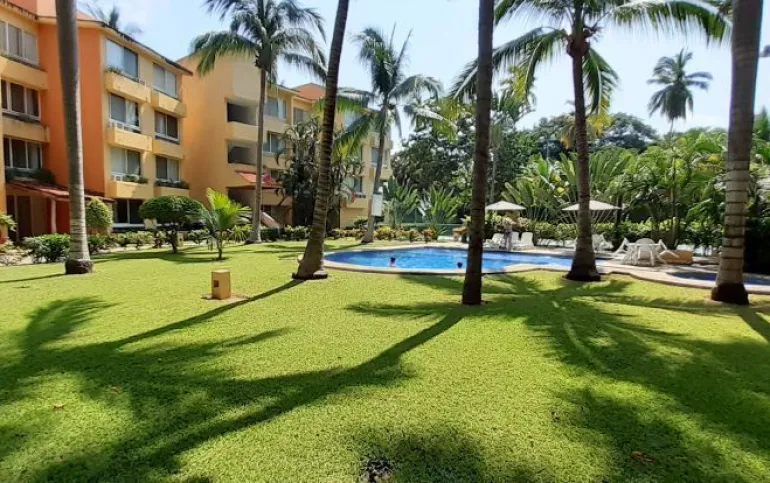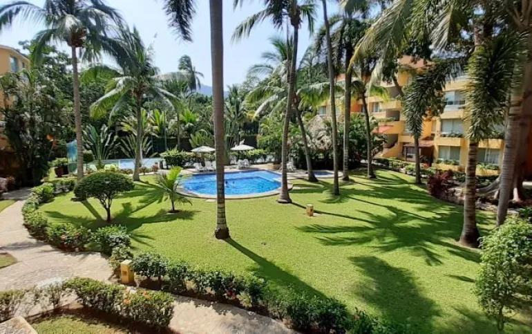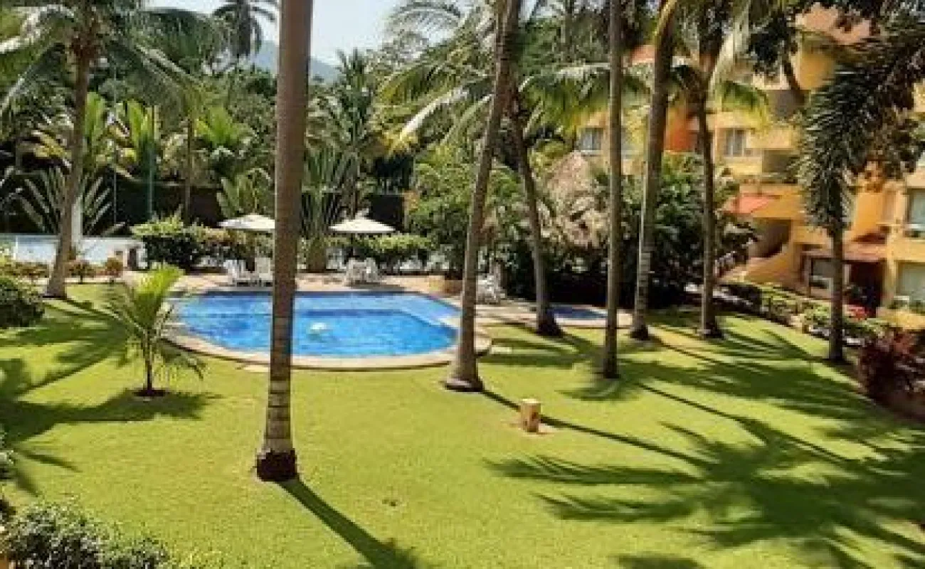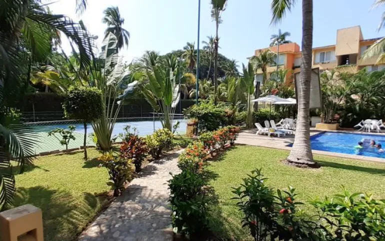 Vendo departamento en condominio con alberca, jardín y cancha de tenis, en Ixtapa, Zihuatanejo, Gro. Departamento de 120 m2, en primer piso. Estancia sala-comedor con A/A minisplit y vista a la alberca, cocina integral abierta con barra, recámara principal con closet, baño, A/A minisplit y vista a la alberca, al jardín y a la cancha de tenis, baño de visitas completo (compartido con la 1a. recámara junior), 1a. recámara junior con closet, baño, A/A minisplit y vista al jardín trasero, 2a. recámara junior con closet y vista a la alberca, cuarto de lavado integrado con baño completo, un cajón de estacionamiento independiente, en condominio de 28 departamentos, amplio jardín interior con espectaculares palmeras, hermosa alberca con chapoteadero, palapa con tarja, cancha de tenis, caseta de vigilancia con portero 24 horas. El condominio cuenta con impecable administración externa, servicio de limpieza y lavado de blancos. El condominio está ubicado a 4 minutos de los hoteles Barceló Ixtapa y Pacífica Resort Ixtapa, a 2 minutos del Campo de Golf Ixtapa, a 8 minutos de Marina Ixtapa y de Naútica Golf Course. Ixtapa se localiza a 15 km de Zihuatanejo. Ixtapa y Zihuatanejo se distinguen por sus hermosas playas (La Ropa, Las Gatas, Playa Quieta, El Palmar, La Isla, etc.). Ixtapa está ubicado en 2.5 horas de la hermosa ciudad de Morelia, Mich.