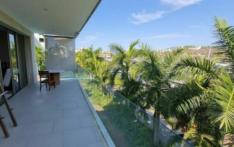 Departamento de lujo completamente amueblado con una superficie habitable de 140 m2, 3 recámaras, 2 baños, terraza con vista a la marina y a la alberca, garaje techado para 2 autos, y 2 bodegas.