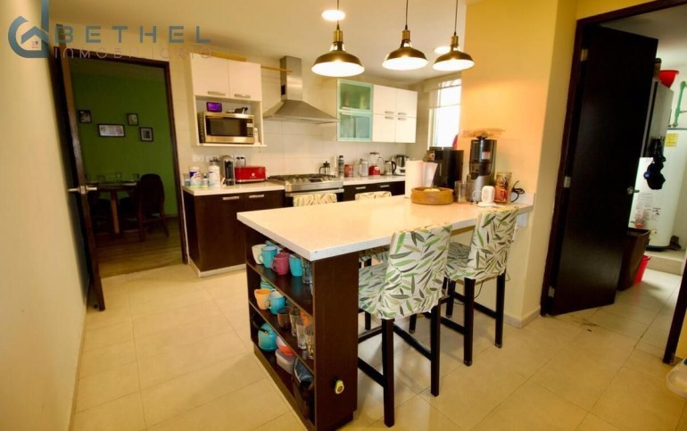 La cocina ha sido completamente remodelada, equipada con mobiliario moderno y espacio funcional para almacenamiento y preparación de alimentos. Ideal para quienes disfrutan del arte culinario.