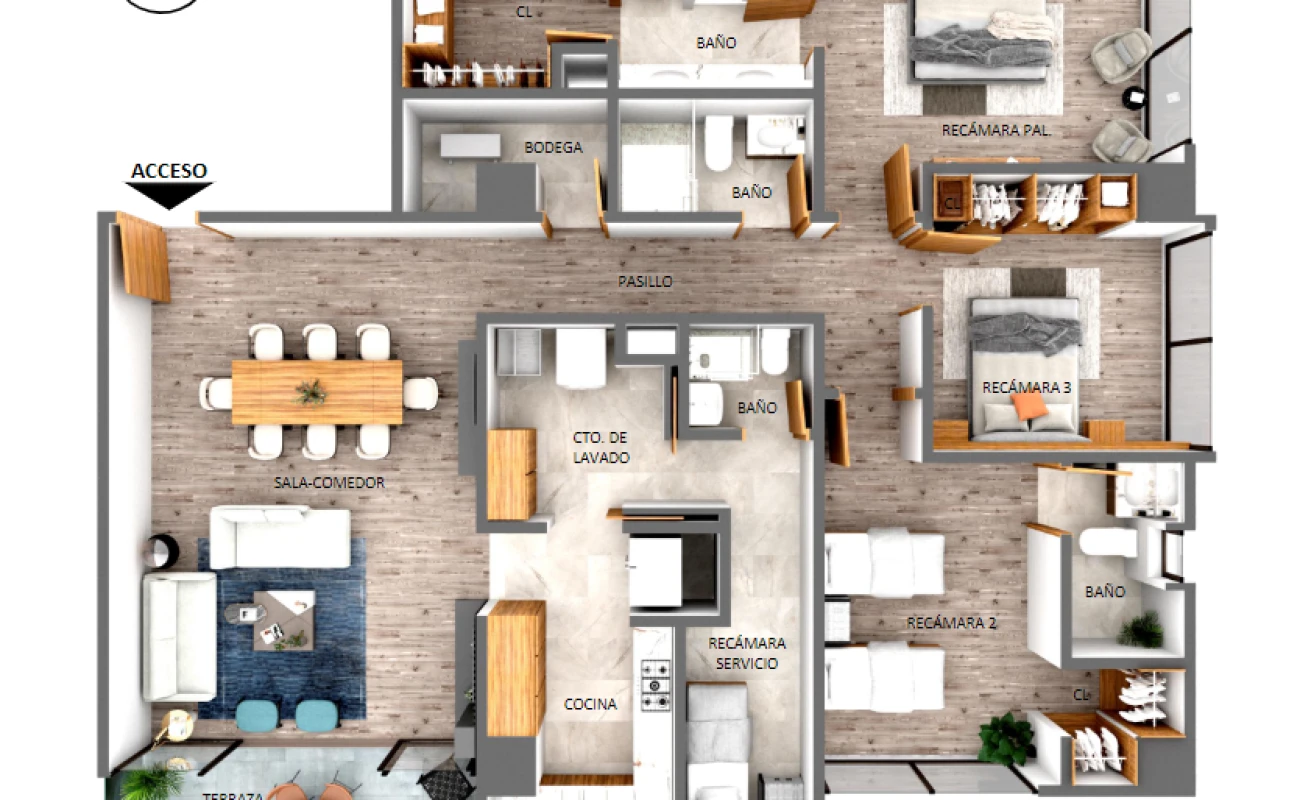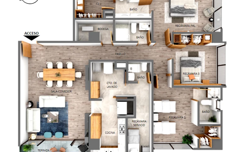 Imagina disfrutar de amplios espacios en la sala-comedor, relajarte en la terraza mientras contemplas vistas panorámicas, y descansar en la cómoda recámara principal con baño privado y walk-in closet. Además, encontrarás una recámara junior también con walk-in closet, perfecta para tus invitados o como espacio adicional para tus necesidades. El departamento cuenta además con un baño para visitas, una práctica bodega, una cocina equipada, un cuarto de lavado y una recámara de servicio con baño propio.