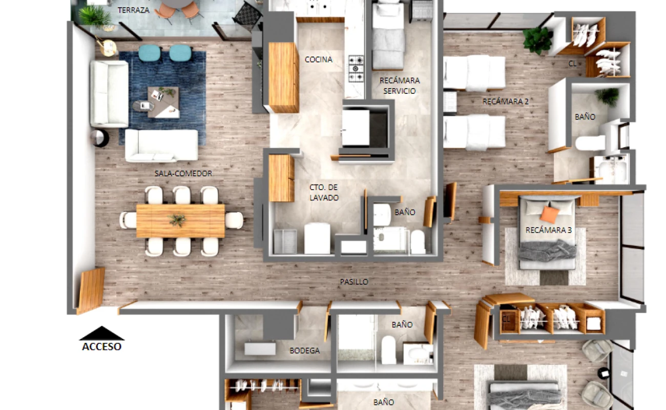 Con una distribución inteligente, encontrarás una amplia sala-comedor que se conecta a una encantadora terraza, donde podrás relajarte y disfrutar de las vistas. Además, cuenta con una recámara principal que ofrece privacidad y confort con su propio baño y walk-in closet. La recámara junior también cuenta con su walk-in closet, y para mayor comodidad, el departamento incluye un baño para visitas, bodega, cocina equipada, cuarto de lavado y una recámara de servicio con baño.
