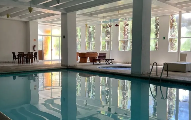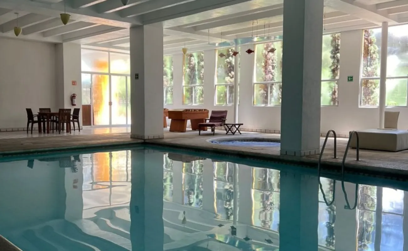 Amenidades: alberca techada, jacuzzi, cancha de pádel, gimnasio, jardín y salón de eventos.