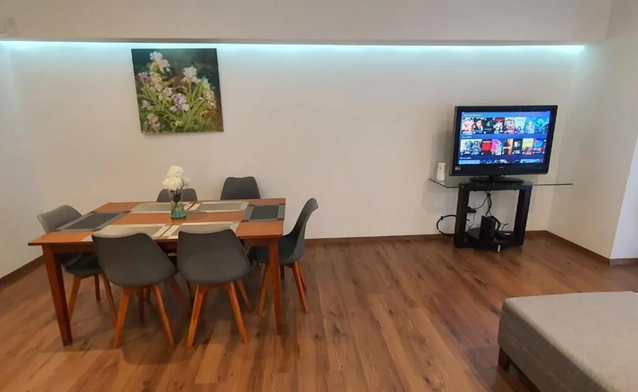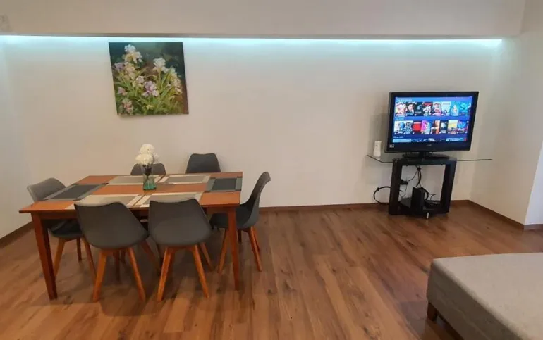 Tiene piso de madera de ingeniería y porcelanato en las áreas húmedas.