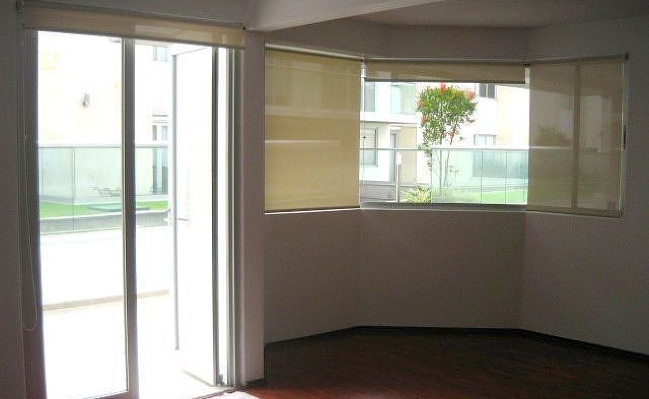 Cortinas Hunter Douglas, lámparas y piso laminado.
