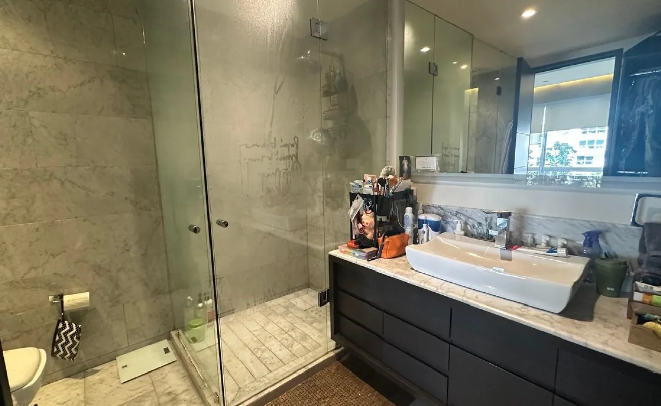 Cuenta con 3 recamaras, la recamara principal con vestidor y baño completo, las secundarias con closet y comparten baño; sala y comedor de gran tamaño, baño de vistas, cocina abierta integral equipada con amplia despensa, área de lavandería y baño de servicio completo. 2 lugares de estacionamiento. Ventanales de piso a techo con vista directa al Parque la Mexicana, acabados de lujo e iluminación natural en todo el departamento.