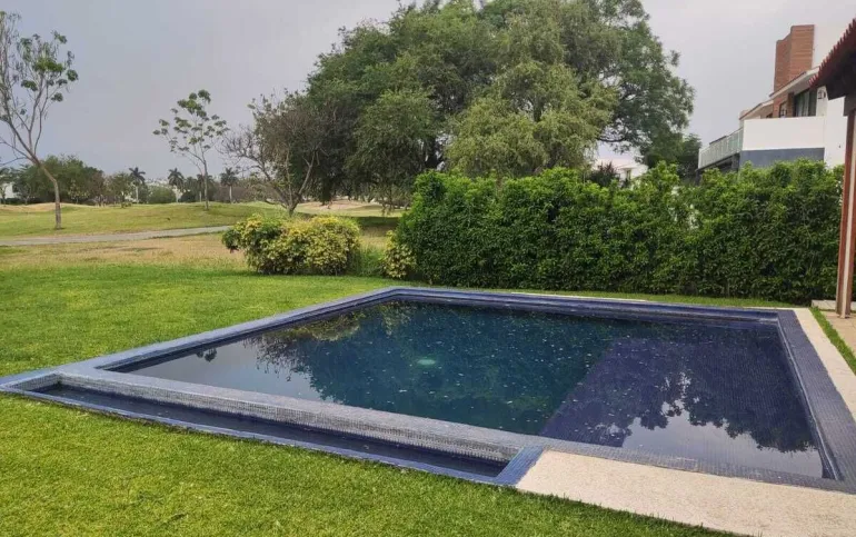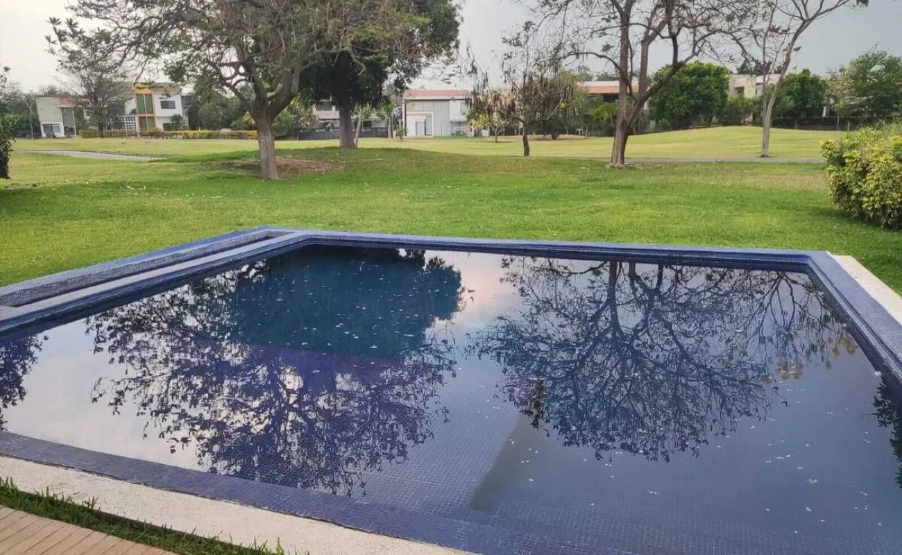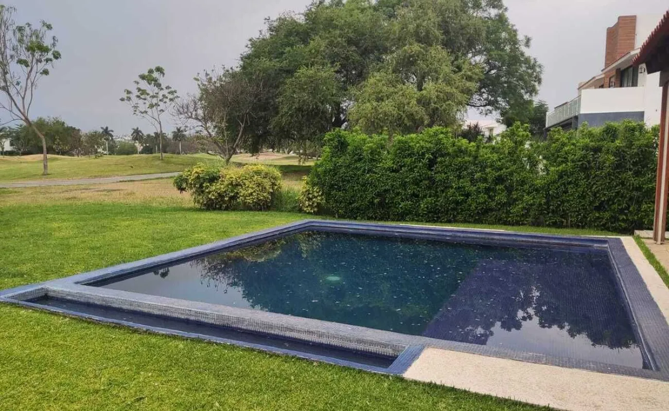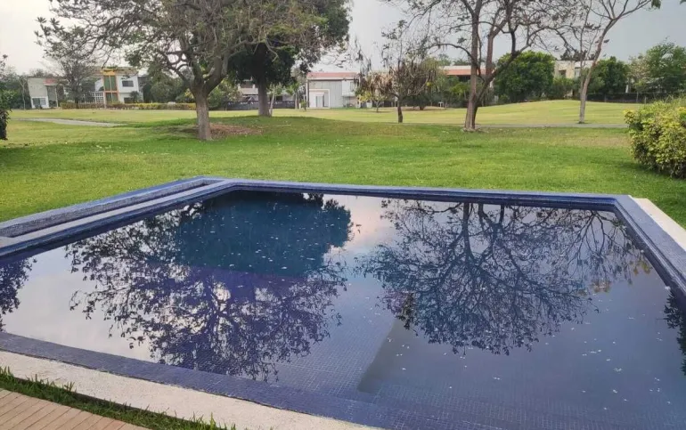 Estacionamiento techado para 3 autos, jardín con terraza, alberca de 6m x 6m y 1 de profundidad, 2 cisternas con hidroneumático, sistema de riego programable, bodega cerrada y mueble de almacenamiento.