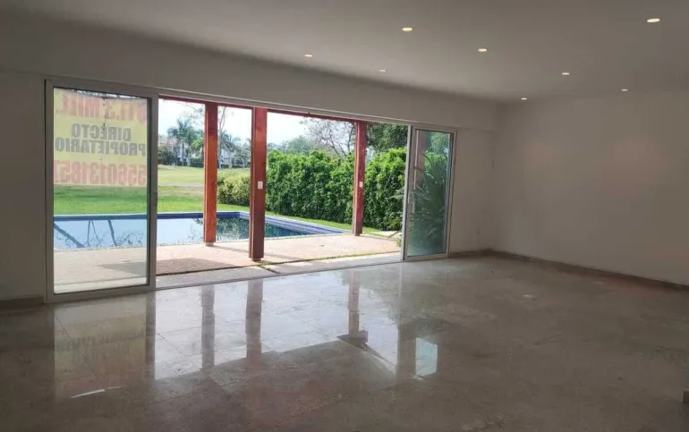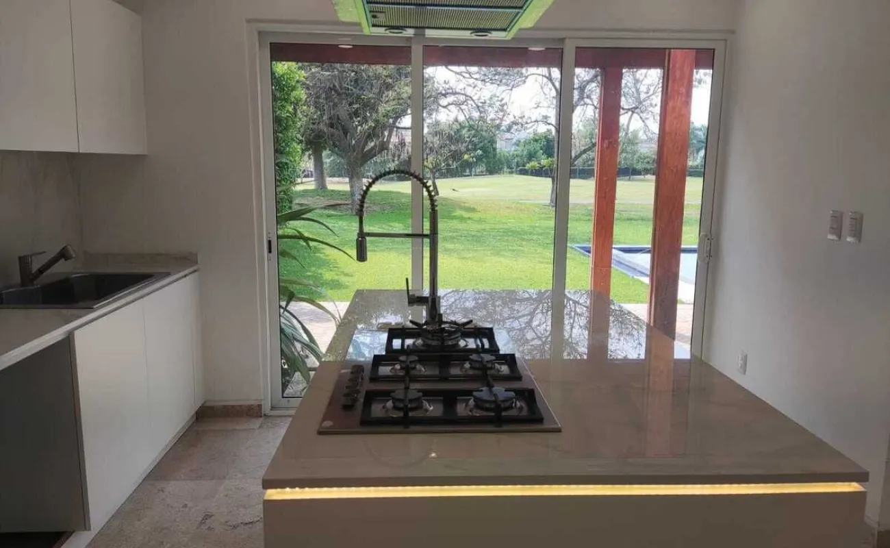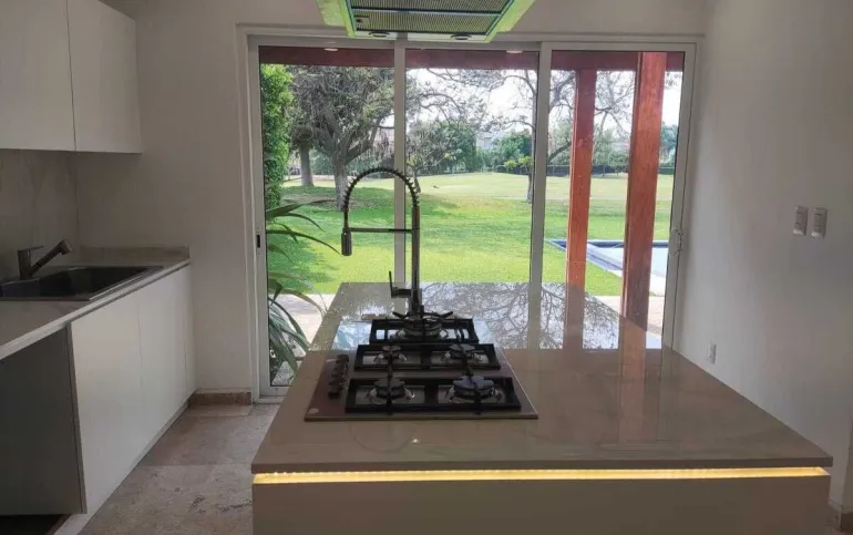 Recibidor, sala comedor con enormes ventanales vista al jardín y al fairway, estudio, cocina integral equipada con isla, alacena independiente, cuarto de servicio con baño completo, área de lavado, baño de visitas completo, bodega debajo de la escalera, closet de blancos.
