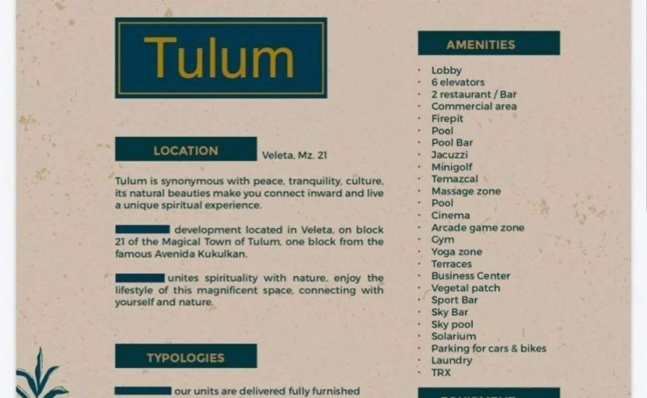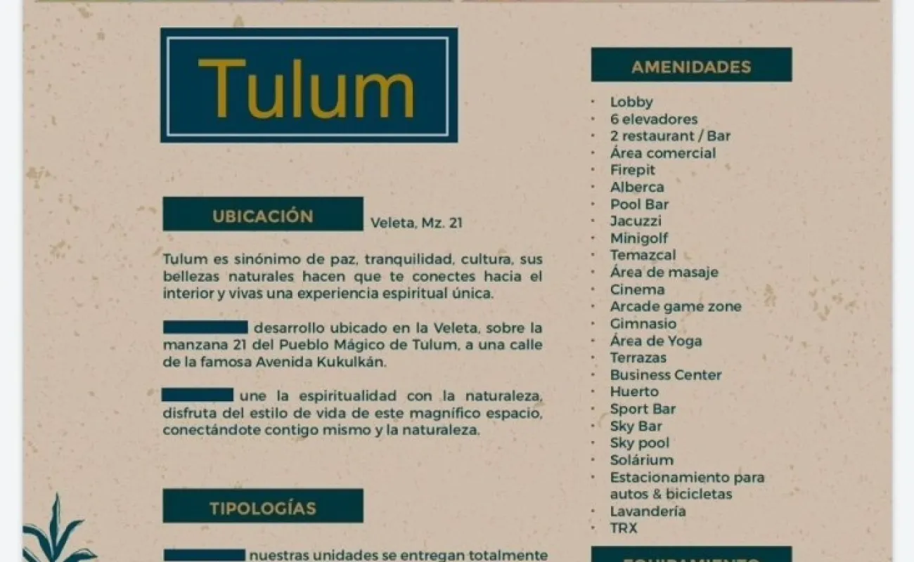 Este gran Proyecto está ubicado en La Veleta a 1 cuadra de la Av. Kukulkan y a 1 cuadra de la entrada de Aldea Zamá, contará con 350 unidades en 2 etapas, se entrega en Diciembre del 2025, está vendido a la fecha al 85%, no dejes pasar esta gran oportunidad.
